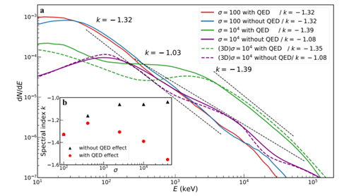 针对两个阶段的集成跨尺度数值模拟中,合作团队首先通过动理学粒子模拟QED磁重联过程,揭示了QED效应对磁重联加速产生的粒子能谱幂率谱谱指数和截止能量的显著影响;并通过调控磁重联磁化参量(定义为磁能密度和物质焓密度的比值),获得QED磁重联加速过程产生的高能粒子(正负电子)能谱(如图2)。接下来,合作团队将逆康普顿散射蒙特卡罗计算模块自洽耦合入粒子模拟程序,将模拟尺度从微观动理学扩展到宏观天文学尺度,并将第一阶段磁重联加速得到的高能粒子和从磁陀星光球层发射的背景软 X 射线光子注入模拟空间,考虑共振散射效应,开展多次逆康普顿散射过程的大尺度模拟,最终获得经过多次散射后的硬X射线谱,与HXMT观测能谱相比对,限定了FRB 200428-X区域的磁化参数区间(如图3)。数值模拟清晰地展示了强磁场环境下QED效应对磁重联微观粒子加速过程和宏观天文观测结果的显著影响,为研究极端环境下天文观测数据提供了新的思路。