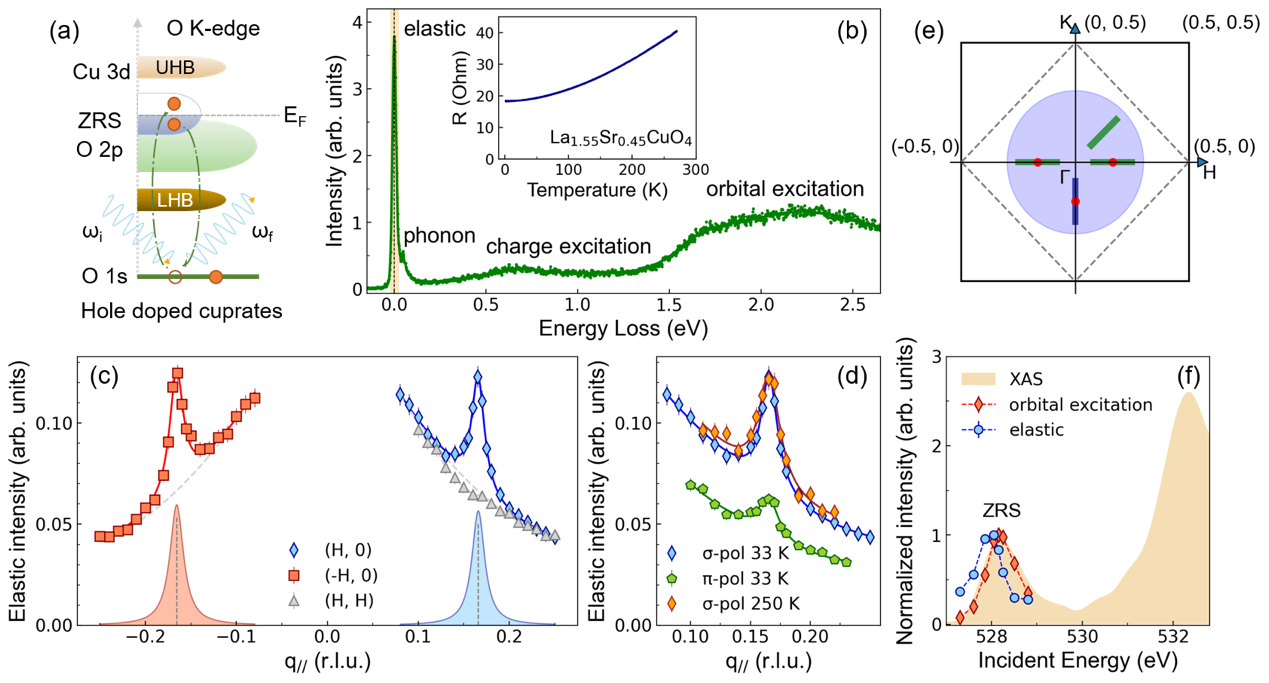 图1:利用共振X射线散射探测LSCO (x=0.45)薄膜沿Cu-O键方向的电荷序,其强度在氧吸收边具有共振行为。