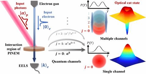 图1基于自由电子与超快光场相互作用实现光学猫态制备的原理示意图。
