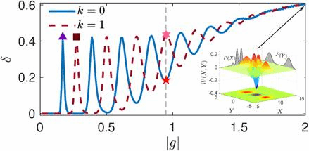 图2输出光场量子态的Wigner负性δ随耦合强度|ց|的增加而发生振荡,并在耦合强度较大时达到饱和。当Wigner负性达到峰值处时,可实现高保真光学猫态的制备。