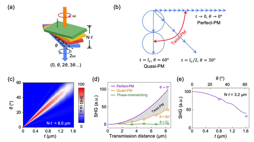 研究团队发现,晶体界面转角可以引入非线性几何相位,通过设计堆垛晶体的转角和晶体的厚度,可以实现光学参量过程中的相位匹配,即第三类相位匹配理论——转角相位匹配。同时,研究团队探索发现二维轻元素材料菱方氮化硼具有深紫外的带隙、优异的物理化学稳定性、超高的激光损伤阈值和非线性系数,是非常理想的紫外光学晶体材料。基于界面转角相位匹配理论,团队成功制备了第三类光学晶体,转角菱方氮化硼(TBN)光学晶体。TBN晶体在宽光谱范围内实现了光学倍频转换效率的突破,3.2微米厚度下可达8%,同厚度下相较于传统晶体提升了100-10000倍,是世界已知最薄的光学晶体。此外,转角相位匹配赋予TBN全新的功能,使其能够有效调控参量光的偏振态。这一突破为新一代“极限波长”、“极限尺寸”、“极限稳定”激光技术的革新奠定了理论和材料基础。