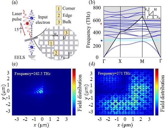 但在PINEM实验中,电子-近场之间的耦合强度较弱。如果通过增加激光功率来增强相互作用,则会导致不可逆的样品损伤。人们提出了利用棱镜表面的倏逝行波增加光与近场的相互作用长度。然而,这种方法依赖于自由电子波包与泵浦光脉冲之间的时间同步以及相位匹配条件,自由电子与局域电磁场之间的耦合仍然很弱。另外一方面,拓扑光子学是研究光在拓扑非平庸介质中传播特性的领域,它利用数学中拓扑的概念来设计具有特殊传输特性的光学结构。拓扑角态是一种高阶的拓扑态,指的是在二维或三维光子晶体角落处局域化的光模式。这些模式由系统拓扑不变性保护,因而对结构缺陷和外在微扰不敏感。这种特性使得拓扑角态在光学隔离器、传感器以及激光器等领域具有重要应用潜力。