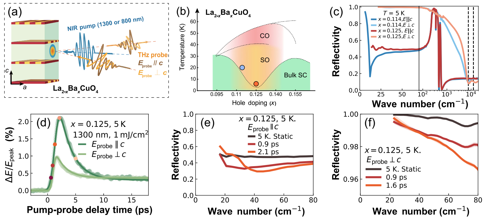 图1:La2-xBaxCuO4样品在偏振平行于c轴近红外NMR泵浦光激发后的瞬态太赫兹响应,其中(a)NIR泵浦-太赫兹探测示意图,(b)La2-xBaxCuO4体系相图(源自PhysRevB.83.104506),(c)x=0.125与0.114样品在温度为5K时平衡态ab平面和c轴方向的反射率,(d)x=0.125样品正常态5K温度时在1300 nm泵浦光激发后太赫兹电场相对变化随时间延迟的依赖行为,(e)考虑泵浦光和太赫兹探测光穿透深度不匹配效应后计算得到的c轴太赫兹反射率,低频出现类似约瑟夫森等离子体边的特征,(f)泵浦后ab平面太赫兹反射率降低,与超导凝聚性质相反。