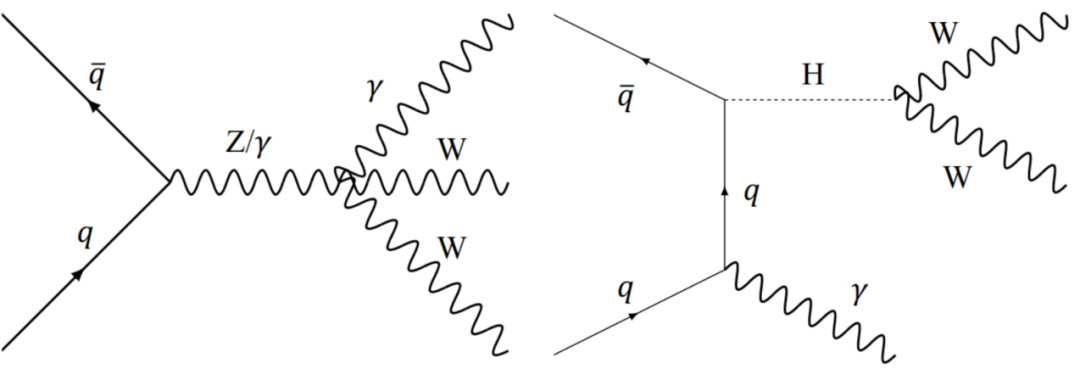 双W玻色子与光子这一新型的三玻色子联合产生过程的示意图