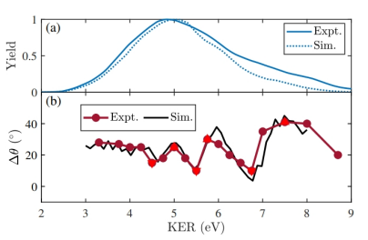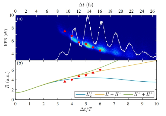 飞秒激光具有超短的脉冲宽度和超高的峰值功率,与分子相互作用,会发生电离、解离和库伦爆炸等超快过程。原子分子内电子运动的本征时间尺度在阿秒(10-18s)量级,追踪和测量原子或分子中电子的运动是物理学家的重要目标之一。由于原子核的质量比电子的质量一般要大3-4个数量级,因此分子库伦爆炸过程通常发生在百飞秒-皮秒量级。通过对库伦爆炸碎片离子的三维动量进行全微分符合测量,分析碎片离子的释放能(Kinetic energy release-KER),可以实现分子构型成像,进而获得原子核间距。实验上通常通过泵浦-探测技术测量时间依赖的离子释放能,进而可以对化学键断裂过程进行动力学成像。由于原子核运动和电子运动时间尺度相差较大,在理论上,经常采用波恩-奥本海默近似(Born-Oppenheimer approximation)对电子和原子核波函数分别进行处理,进而分子体系的波函数可以被写为电子波函数与原子核波函数的乘积。因此,无论是在理论上,还是在实验上,同时研究分子中的电子和原子核动力学过程是非常困难的。