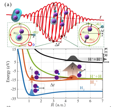 课题组采用双色圆偏振激光,通过光场相干合成发展了双指针阿秒钟技术,在原子分子动力学研究中取得系列进展,如:测量了光电离电子波包的振幅和相位[Han et al., Phys. Rev. Lett. 120, 073202 (2018)],原子电子自旋轨道相互作用导致延迟时间 [Ge et al., Phys. Rev. Lett.126, 223001 (2021)]以及对隧穿时间问题的争议进行了澄清 [Han el al., Phys. Rev. Lett 23, 073201 (2019)]等。最近,课题组采用双指针阿秒钟对氢气分子双电离开展实验研究。在超强激光作用下,氢气分子将会释放两个质子和两个电子,这是典型超强激光作用下的四体问题。由于电子的出射是瞬时的,可以通过圆偏振阿秒钟进行计时,而氢分子核间距可以从质子库伦爆炸的释放能获得,进而可对化学键断裂过程进行计时。通过对所有碎片粒子反应产物动量的测量,可实现强激光作用下氢气分子四体相互作用动力学过程研究,其测量原理如图1所示。