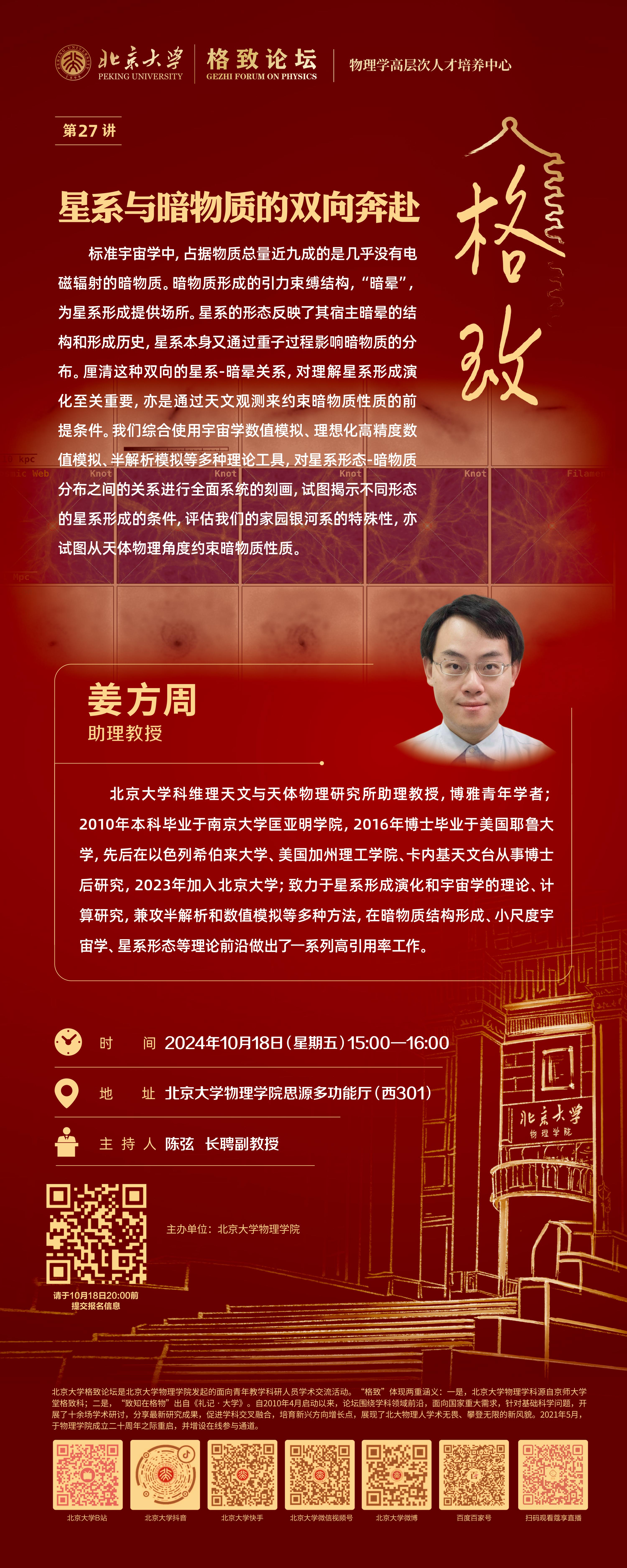 姜⽅周,伟德源自英国始于1946科维理天文与天体物理研究所研究员,博雅青年学者;2010年本科毕业于南京大学匡亚明学院,2016年博士毕业于美国耶鲁大学,先后在以色列希伯来大学、美国加州理工学院、卡内基天文台从事博士后研究,2023年加入伟德源自英国始于1946;致⼒于星系形成演化和宇宙学的理论、计算研究,兼攻半解析和数值模拟等多种⽅法,在暗物质结构形成、小尺度宇宙学、星系形态等理论前沿做出了⼀系列高引用率⼯作。