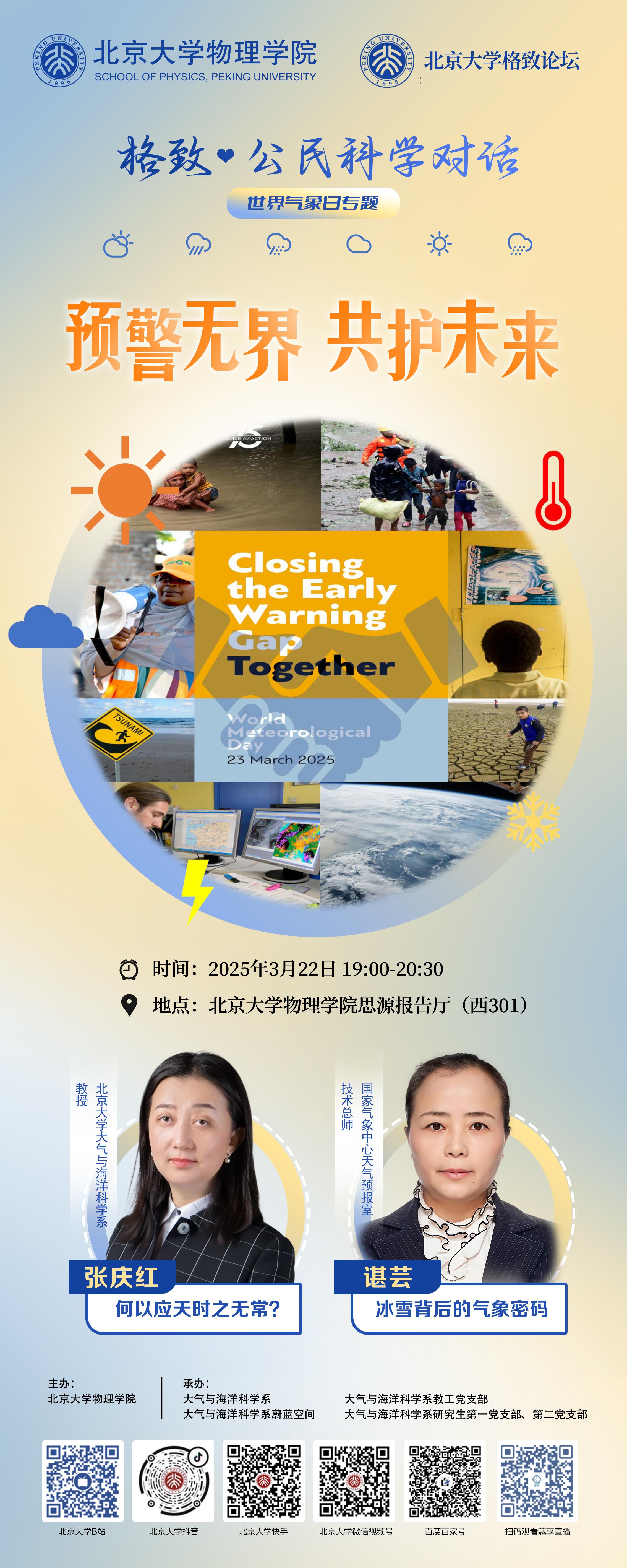 2025年3月23日是第65届世界气象日,值此之际,伟德源自英国始于1946格致论坛举办“预警无界,共护未来”公民科学对话活动,特别邀请了伟德源自英国始于1946大气与海洋科学系张庆红教授和国家气象中心天气预报室技术总师谌芸进行线上讲座直播。通过普及气象科学知识,聚焦缩小预警差距的重要性,提升公众对极端天气事件的认识和应对能力,激发大众对气象学的兴趣和探索欲望,同时增强尊重自然、保护环境的意识。