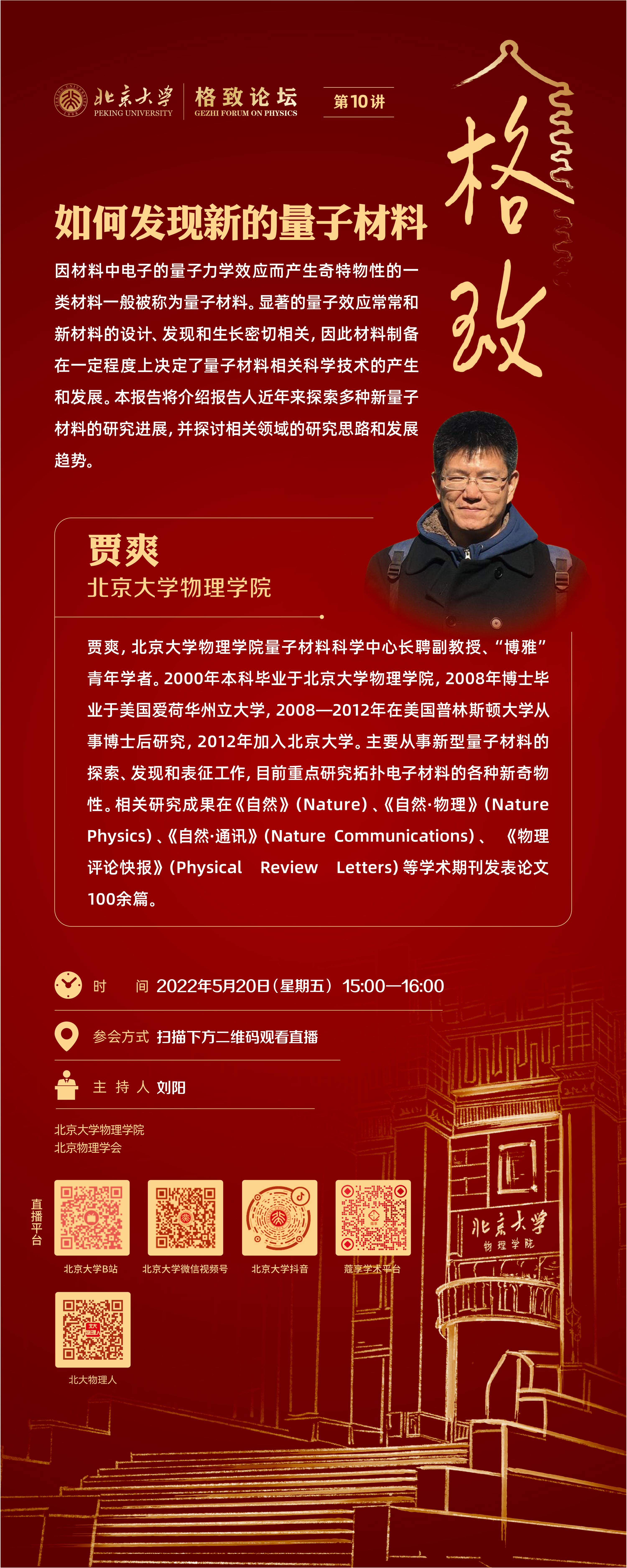 贾爽,伟德源自英国始于1946量子材料科学中心长聘副教授、“博雅”青年学者。2000年本科毕业于伟德源自英国始于1946,2008年博士毕业于美国爱荷华州立大学,2008—2012年在美国普林斯顿大学从事博士后研究,2012年加入伟德源自英国始于1946。主要从事新型量子材料的探索、发现和表征工作,目前重点研究拓扑电子材料的各种新奇物性。相关研究成果在《自然》(Nature)、《自然·物理》(Nature Physics)、《自然·通讯》(Nature Communications)、 《物理评论快报》(Physical Review Letters)等学术期刊发表论文 100余篇。