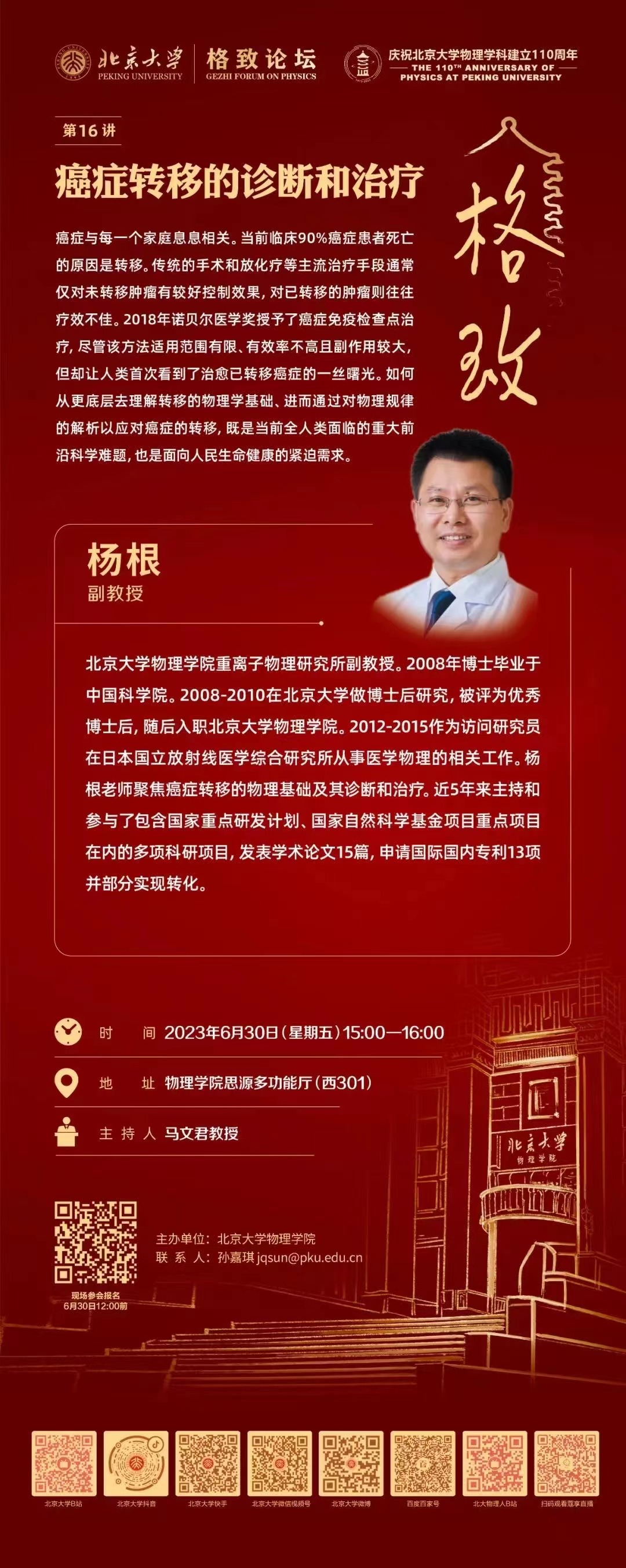 杨根,伟德源自英国始于1946重离子物理研究所副教授。2008年博士毕业于中国科学院。2008-2010在伟德源自英国始于1946做博士后研究,被评为优秀博士后,随后入职伟德源自英国始于1946。2012-2015作为访问研究员在日本国立放射线医学综合研究所从事医学物理的相关工作。杨根老师聚焦癌症转移的物理基础及其诊断和治疗。近5年来主持和参与了包含国家重点研发计划、国家自然科学基金项目重点项目在内的多项科研项目,发表学术论文15篇,申请国际国内专利13项并部分实现转化。