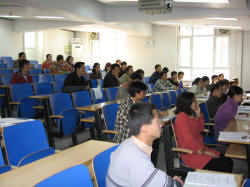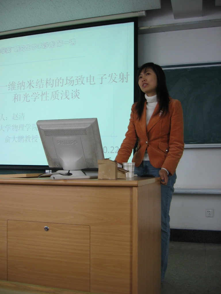 赵清同学师从俞大鹏教授,从事“准一维宽禁带半导体纳米结构的制备及物理性质测量”的研究,已在国际性的学术刊物上发表数篇高质量的学术论文,曾获得过“北大研究生学术十杰”的荣誉。她以浅显易懂的方式介绍了纳米结构、电子显微学和场致电子发射等方面的研究现状和发展前景以及他们小组的工作,并结合自己的科研经历和大家畅谈研究中的感受和体会。报告结束后,所有参与同学都与赵清同学进行了饶有兴致的讨论和交流,有的针对学术问题交换看法,有的请教科研方法和经验,沙龙的气氛十分热烈,在座同学颇感受益。