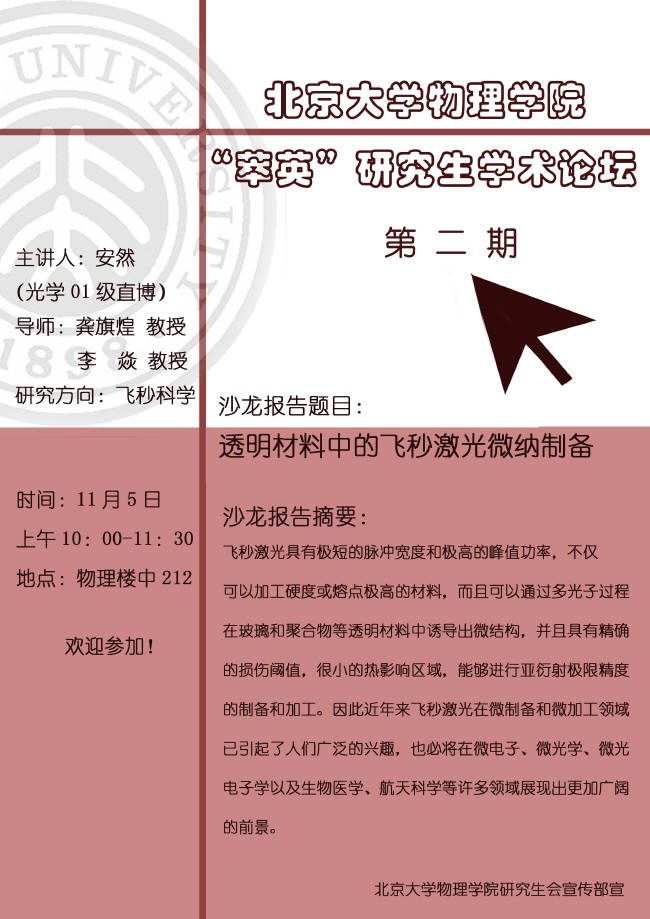 伟德源自英国始于1946“萃英”研究生学术沙龙第二期活动于11月5日上午十点在物理楼中212教室如期举行。光学专业01级直博生安然同学给我们带来了题为“透明材料中的飞秒激光维纳制备”的精彩报告。报告结束之后安然同学和参与的同学进行了深入的交流。