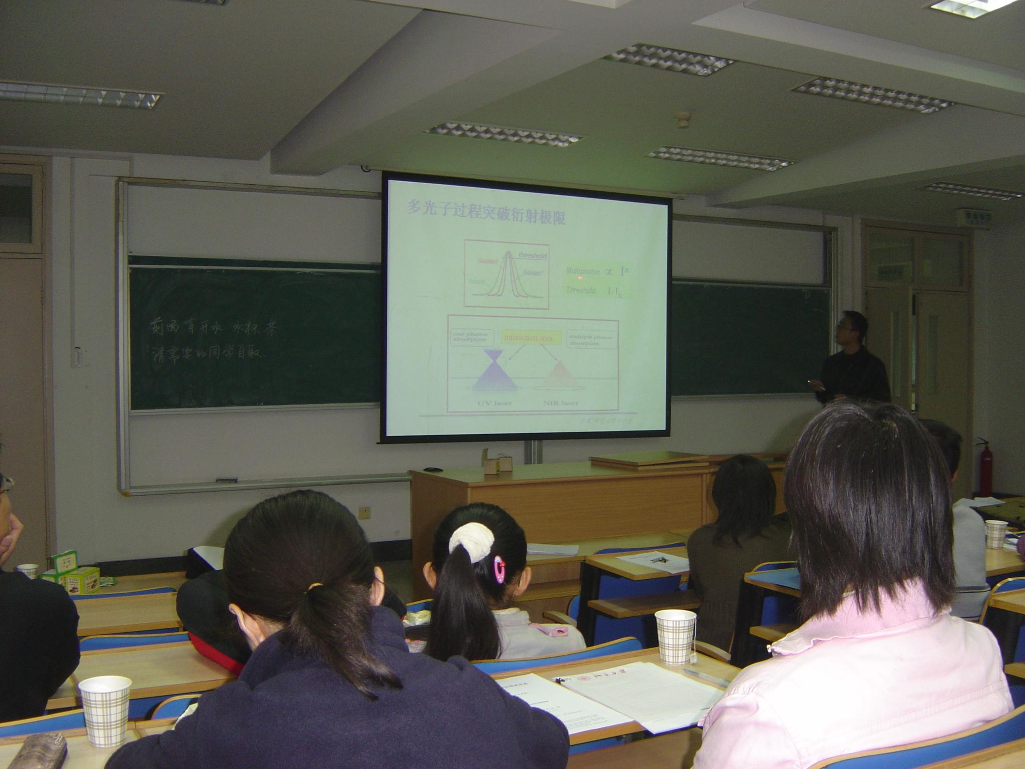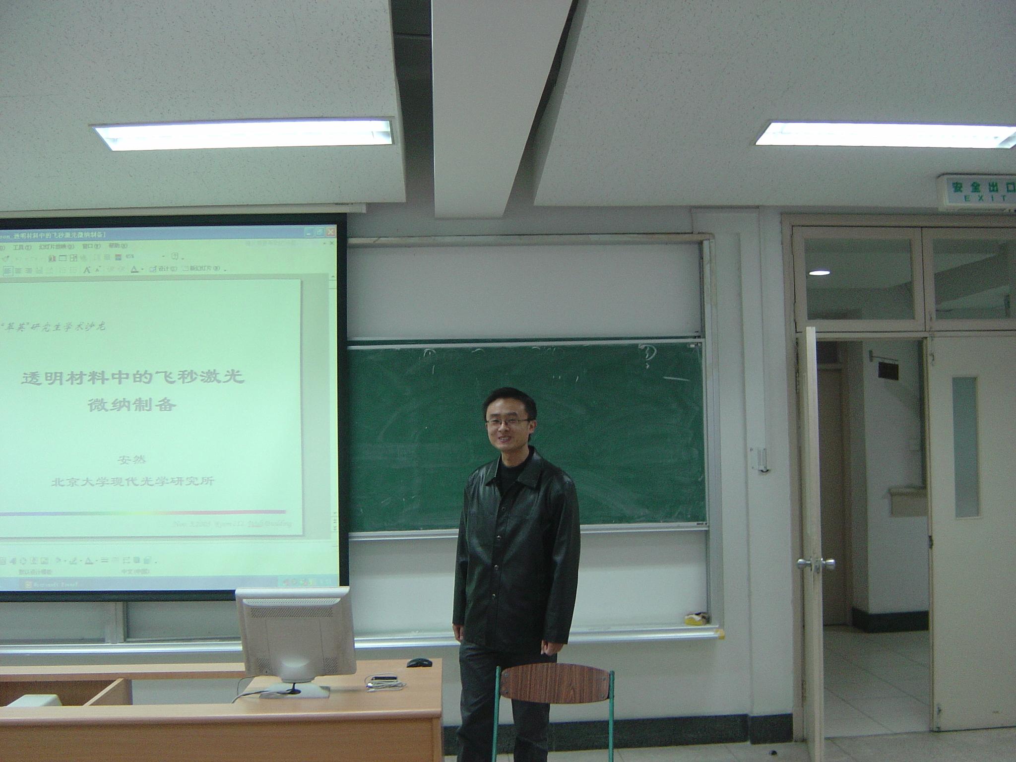 安然同学师从龚旗煌教授和李焱教授,从事“飞秒科学”的研究,已在国际性的学术刊物上发表数篇高质量的学术论文。他深入浅出地介绍了飞秒激光在微制备和微加工领域的研究情况和热点问题,介绍了他们实验小组在飞秒激光烧蚀制备微通道及利用飞秒激光微爆炸制作计算全息图方面的工作,并展望了飞秒激光微纳制备技术在微光学、微光电子学、生物医学以及航天科学等许多领域的应用前景。安然同学的报告生动有趣,在座的同学都被深深地吸引,报告结束后,大家都非常积极地参与了讨论和交流,沙龙的氛围变得更加热烈和融洽。