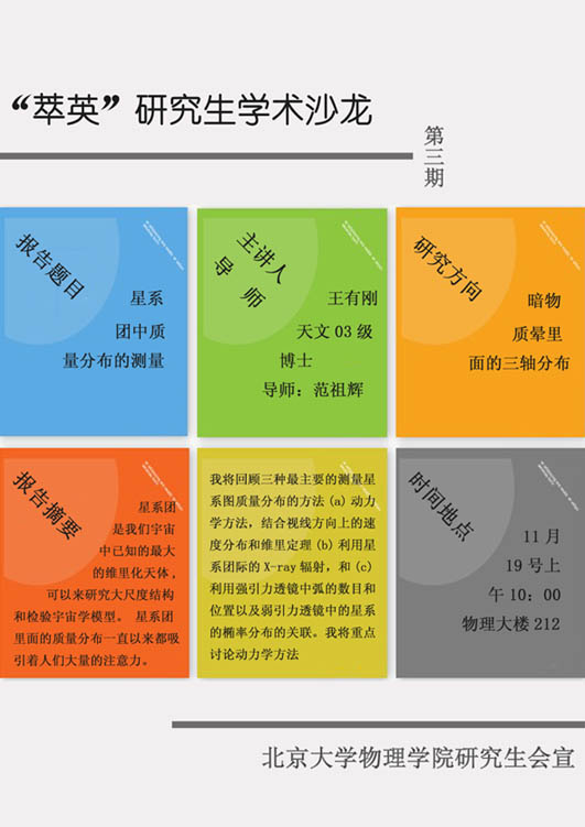 我们所处的宇宙时如何产生和演化的?浩淼的宇宙中能量和质量是如何分布的?人们在地球上又是通过何种手段来知道星空的奥秘的?带着这些问题,天文系03级博士生王有刚同学和大家一起相约在第三期的“萃英”沙龙。报告的题目是“星系团中质量分布的探测”,报告结束后进行了热烈而深入的探讨。