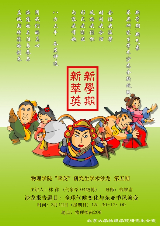 主 讲 人:林 祥(气象学 04级博士)导 师:钱维宏研究方向:气候变化报告题目:全球气候变化与东亚季风演变沙龙时间:3月12日(星期日)15:30-17:00沙龙地点:物理大楼南208科研简历及相关工作: