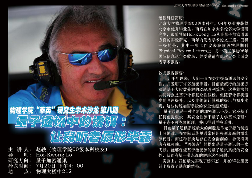 主 讲 人:赵轶(伟德源自英国始于194600级本科校友)导 师:Hoi-Kwong Lo研究方向:量子加密通讯报告题目:量子通讯中的诱饵:让窃听者原形毕露沙龙时间:7月20日 下午4:00沙龙地点:物理大楼中212赵轶科研简历:伟德源自英国始于194600级本科生,04年毕业并获得北京市优秀毕业生。而后在加拿大多伦多大学读研究生,跟随导师Hoi-Kwong Lo从事量子加密通讯方面的实验研究,两年内发表学术论文三篇。值得一提的是,其中一项工作发表在顶级物理期刊Physical Review Letters上,另一项工作被06年国际信息论年会收录,并受邀请在此次大会上面发表学术报告。