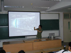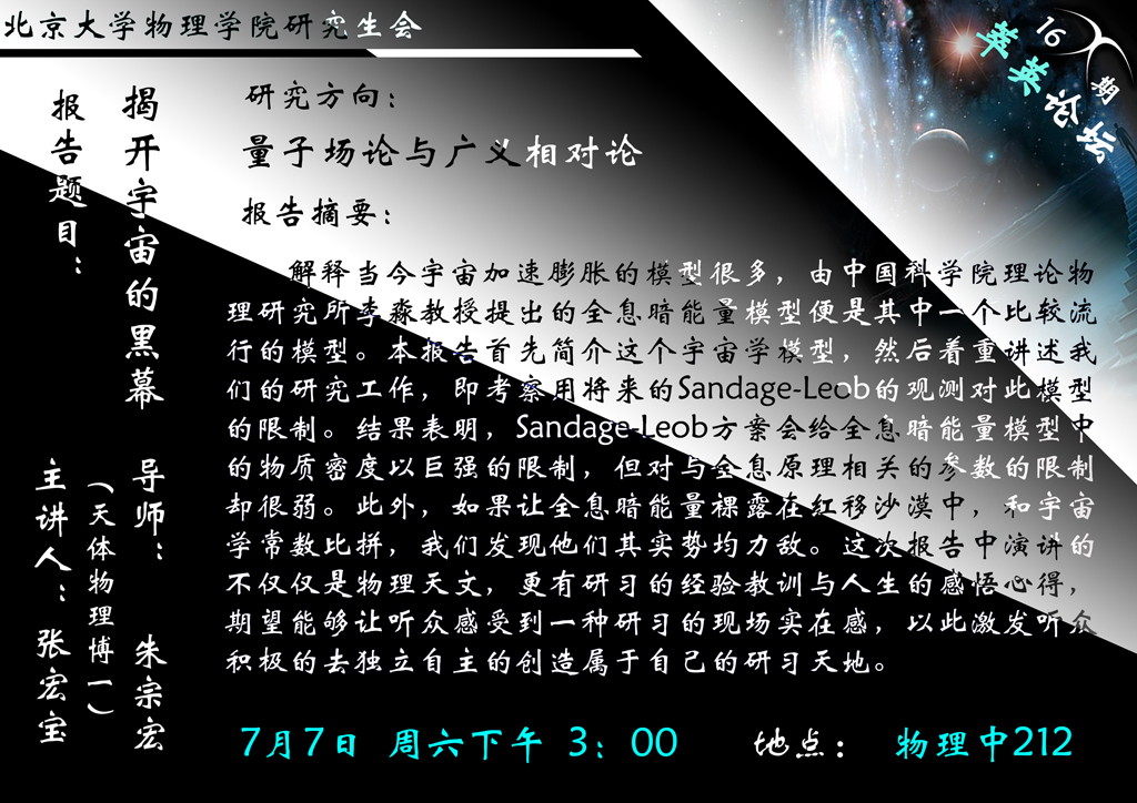 张宏宝博士主要从事于“量子场论和广义相对论”的研究,他这次给我们带来的报告的题目是“揭开宇宙的黑幕”。张宏宝首先简单的介绍了由中国科学院理论物理研究所李淼教授提出的全息暗能量模型,然后重点介绍了他的研究工作,即考察用将来的Sandage-Leob的观测对此模型的限制。