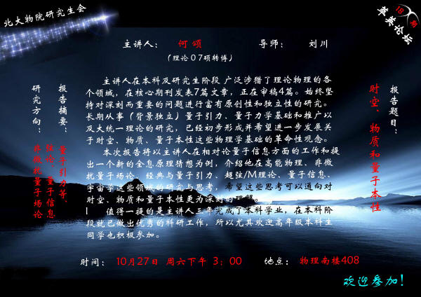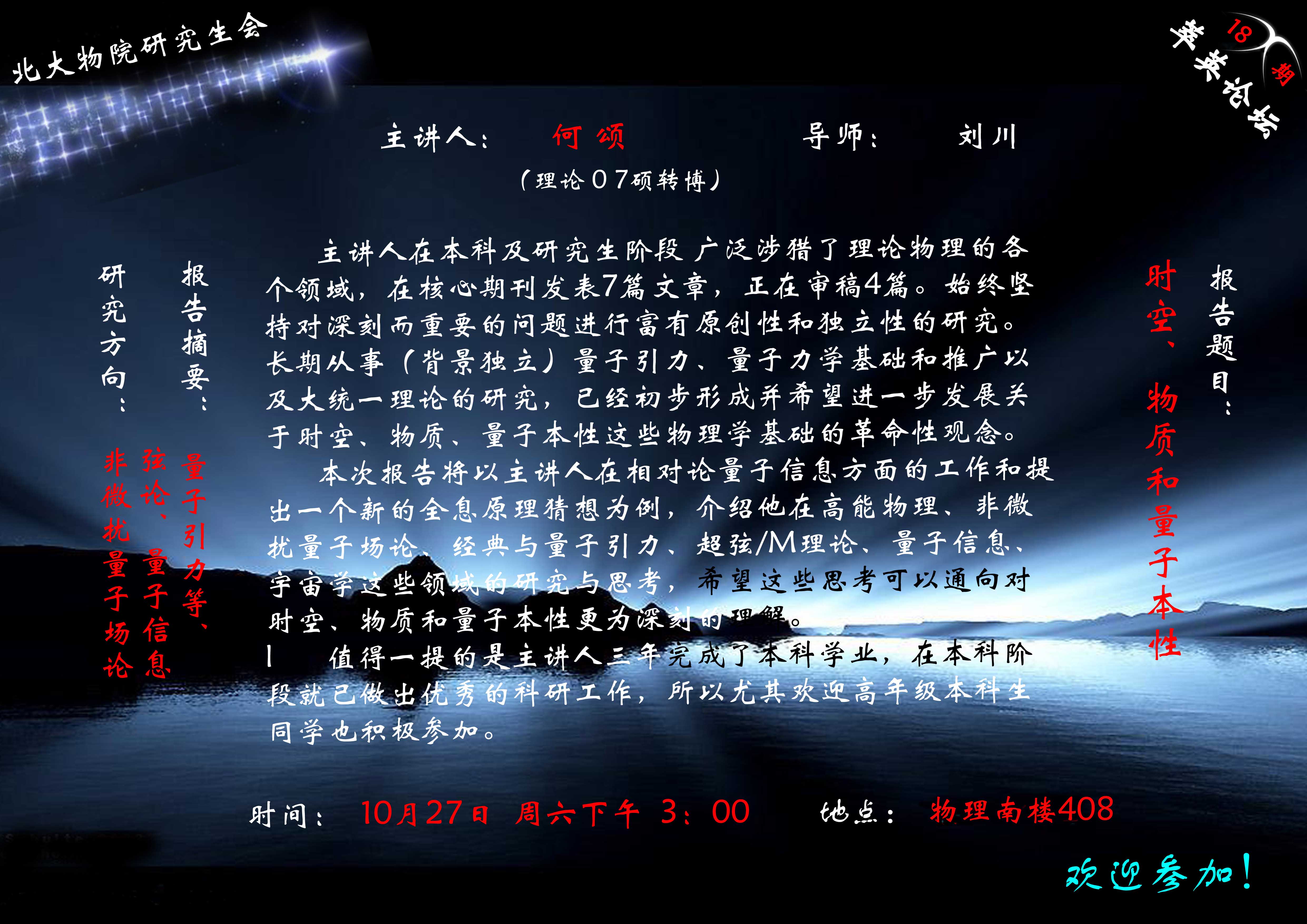 报告人:何颂(07级理论硕转博;导师:刘川)研究方向:相对论Hartree-Fock理论及其应用报告题目:时间,物质和量子本性(Spacetime, Matters and Quantum)沙龙时间:2007年10月27日(周六)下午3:00-5:00沙龙地点:物理南楼408报告摘要:报告人将以他在相对论量子信息方面的工作和提出一个新的全息原理猜想为例,介绍他在高能物理、非微扰量子场论、经典与量子引力、超弦/M理论、量子信息、宇宙学这些领域的研究与思考,希望这些思考可以通向对时空、物质和量子本性更为深刻的理解。报告人简介:何颂同学是理论物理05级硕士,07级硕转博,本科毕业于伟德源自英国始于1946,2002-2005年完成本科学习。本科阶段开始接触科研工作,到目前为止,已经广泛涉猎了理论物理的各个领域,在核心期刊发表7篇文章,正在审稿4篇。始终坚持对深刻而重要的问题进行富有原创性和独立性的研究。长期从事(背景独立)量子引力、量子力学基础和推广以及大统一理论的研究,已经初步形成并希望进一步发展关于时空、物质、量子本性这些物理学基础的革命性观念。