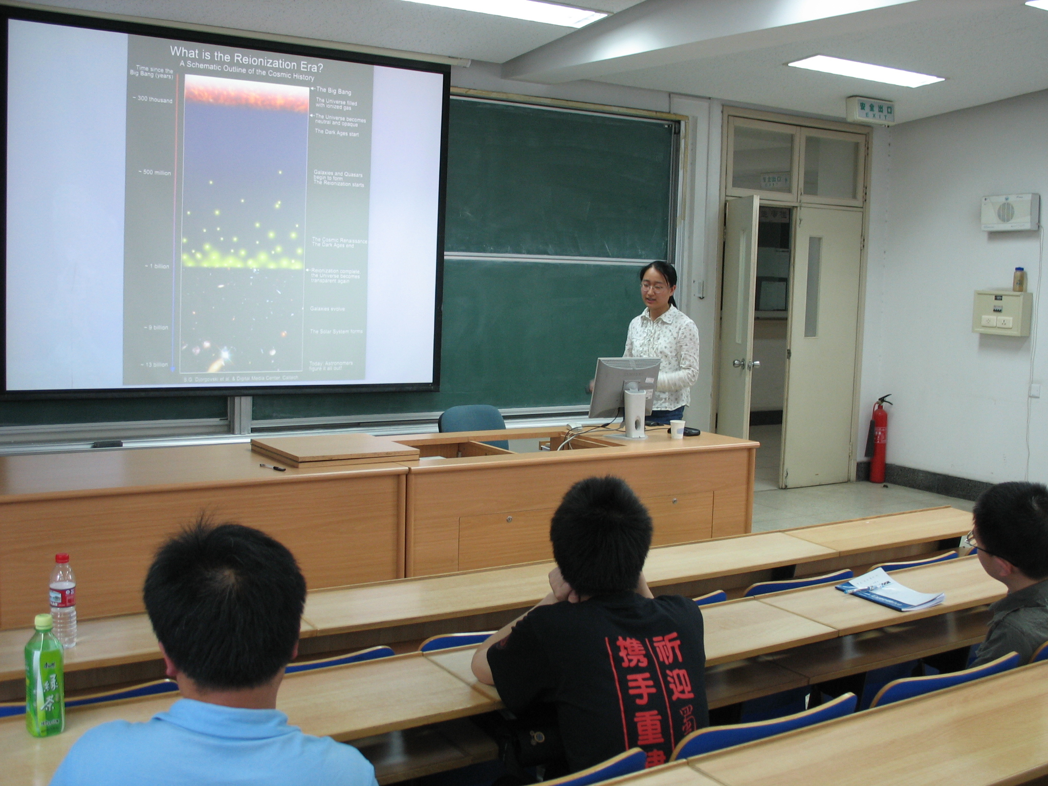 王然博士的研究方向是宇宙早期类星体的毫米波和射电辐射。2006年至2008年间在美国国家射电天文台交流学习。她这次给我们带来的报告题目是“宇宙早期类星体的尘埃辐射及演化”。王博士详细介绍了她们利用IRAM和CSO的毫米波及亚毫米波望远镜,对一些红移大于5的类星体的远红外尘埃辐射的观测结果。