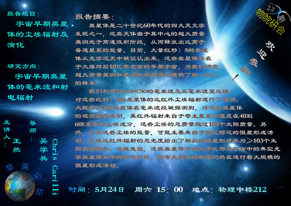 主 讲 人:王然(天体物理直博四年级)报告题目:宇宙早期类星体的尘埃辐射及演化沙龙时间:2008年5月24日(周六)下午3:00-5:00沙龙地点:物理大楼中212报告摘要:类星体是二十世纪60年代的四大天文学发现之一,这类天体由于其中心的超大质量黑洞处于高速吸积阶段,从而释放出远高于普通星系的能量。目前,大量红移>5的类星体从光学巡天中被证认出来。这些类星体存在于大爆炸后10亿年左右的早期宇宙,为我们研究超大质量黑洞和星系的早期演化提供了独一无二的样本。