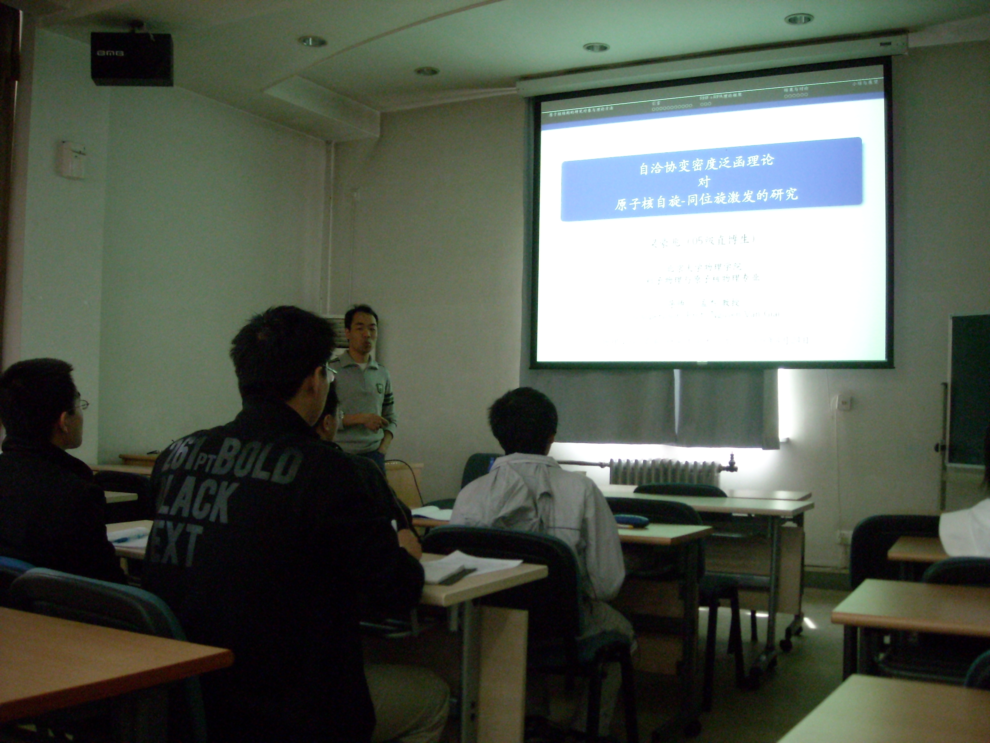 午后的阳光虽然有点炽烈,但“萃英”仍踏着稳健的步伐,准时来到我们身边。4月24日下午3点,“萃英”研究生学术沙龙在物理楼南408成功举行。本期主讲人是粒子物理与原子核物理专业05级直博生梁豪兆。梁豪兆同学师从孟杰老师,主要研究原子核集体激发的微观机制。他科研表现出色,已发表文章数篇,其中一篇以第一作者身份刊登在08年的Phys.Rev.Lett.上。