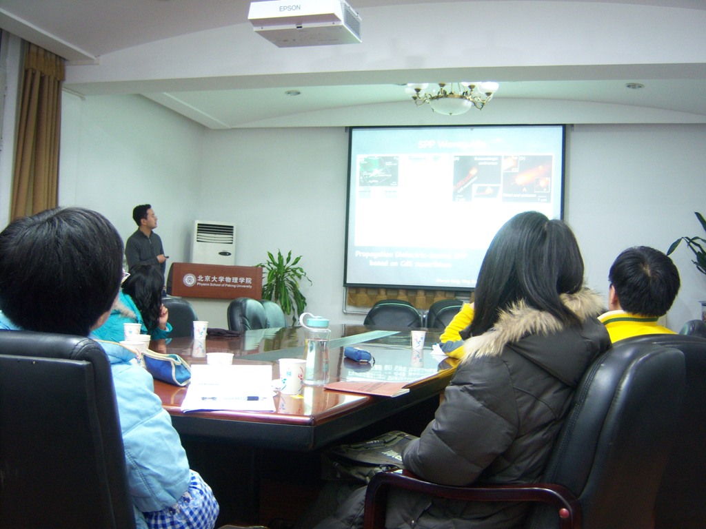 方哲宇同学报告的题目是“表面等离激元在纳米光学器件上的应用”,他以生动简单的语言向我们讲述了他在该方向所做的工作,其中主要解释了他在如何让表面等离激元在银纳米线中的传输过程中获得最大的输出和最小的阻抗的工作。