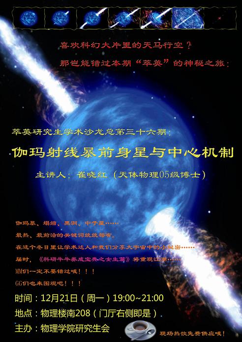 新年即始,学期将末。本学期第四期 “萃英”学术沙龙于2009年12月21日晚19点准时在物理楼南208拉开了帷幕。本次报告的主讲人是来自我院天体物理专业05级的博士生崔晓红同学,她的导师为徐仁新教授。