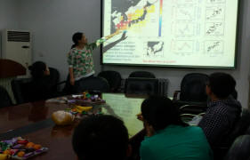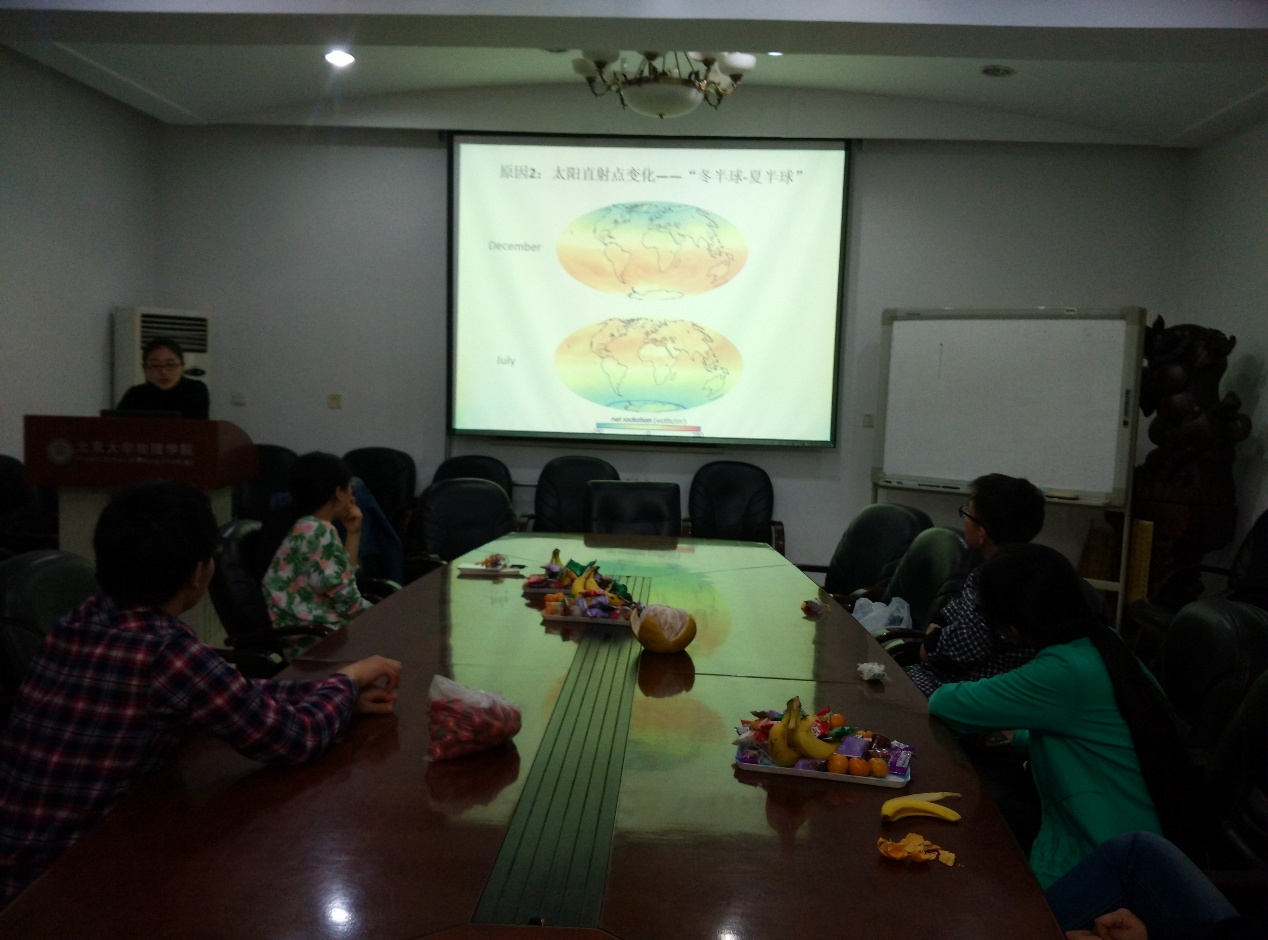 第一位主讲人韩晶,主要从事季风方面的研究。她从根源出发,向大家介绍了大气运动发生的机理,言辞清晰,娓娓道来:由于地球大气热量分布不均匀,大气发生运动以抵消这种不均匀性,进而形成了雨、雪、风等天气和季风等气候现象。此外,她还展示了IPCC描述全球气候变化的各种指标和显示全球变暖及其影响的一些数据。韩晶同学表示,虽然无法判断全球变暖是地球大时间尺度的演化还是人类活动导致的结果,但自觉爱护地球始终是我们义不容辞的责任。