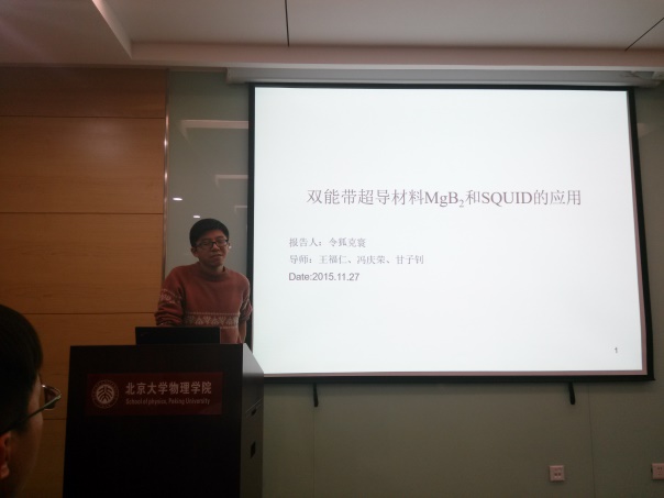 第二位主讲人是凝聚态所2012级直博生令狐克寰。令狐学长主要做的是MgB2超导材料的研究,现在从事超导量子干涉器件SQUID的应用方面的工作。学长主要给我们介绍了双能带超导材料MgB2和SQUID的应用,深入浅出的讲述了超导的原理以及相关超导材料的应用和制备。在提问环节,同学们与两位主讲人进行了进一步的交流,两位学长对于大家的问题都进行了认真专业的解答。