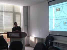 第二位主讲人是14级凝聚态博士生宋化鼎。宋化鼎师兄师从廖志敏教授和俞大鹏院士,主要从事石墨烯异质结等体系的低温强磁场输运实验研究。他在科研上也有出色的成果,已发表SCI论文6篇,其中第一作者或并列一作的论文4篇,发表在Nano Letters、Physical Review B、Applied Physics Letters等期刊上。本次报告他从目前很有应用前景的二维材料石墨烯出发,向大家介绍了他的工作,利用铁酸铋中的铁电性与铁磁性存在自发的磁电耦合,实现了外电场对石墨烯-铁酸铋的磁近邻效应的调制。