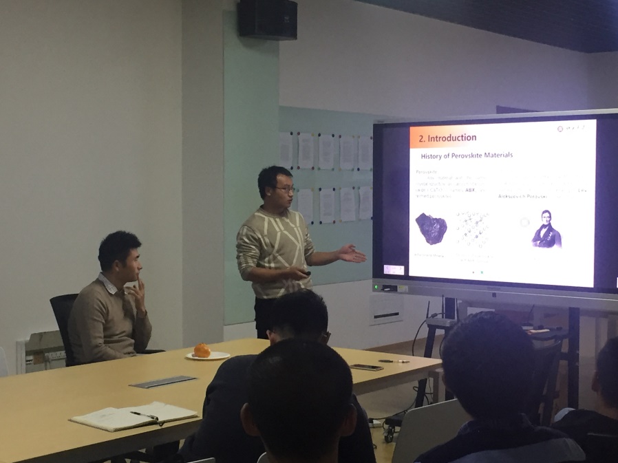 第二位主讲人是16级光学所的博士罗德映,他主要从事高效率反式平面异质结钙钛矿太阳能电池的研究。该师兄已发表高水平SCI论文3篇,其中顶级期刊Science论文一篇,工程技术顶级期刊Advanced Materials与Advanced Functional Materials论文各一篇。他重点向大家介绍了自己目前从事的研究内容和研究成果,从能源问题这个大的研究背景出发,向大家介绍了钙钛矿太阳能电池的原理、研究进展以及面临的问题,并向大家讲述了选择钙钛矿作为太阳能电池原材料的原因,吸光性能好、光电转换效率高、对环境污染小等。最后,又结合自身讲述了太阳电池材料方面存在的问题。