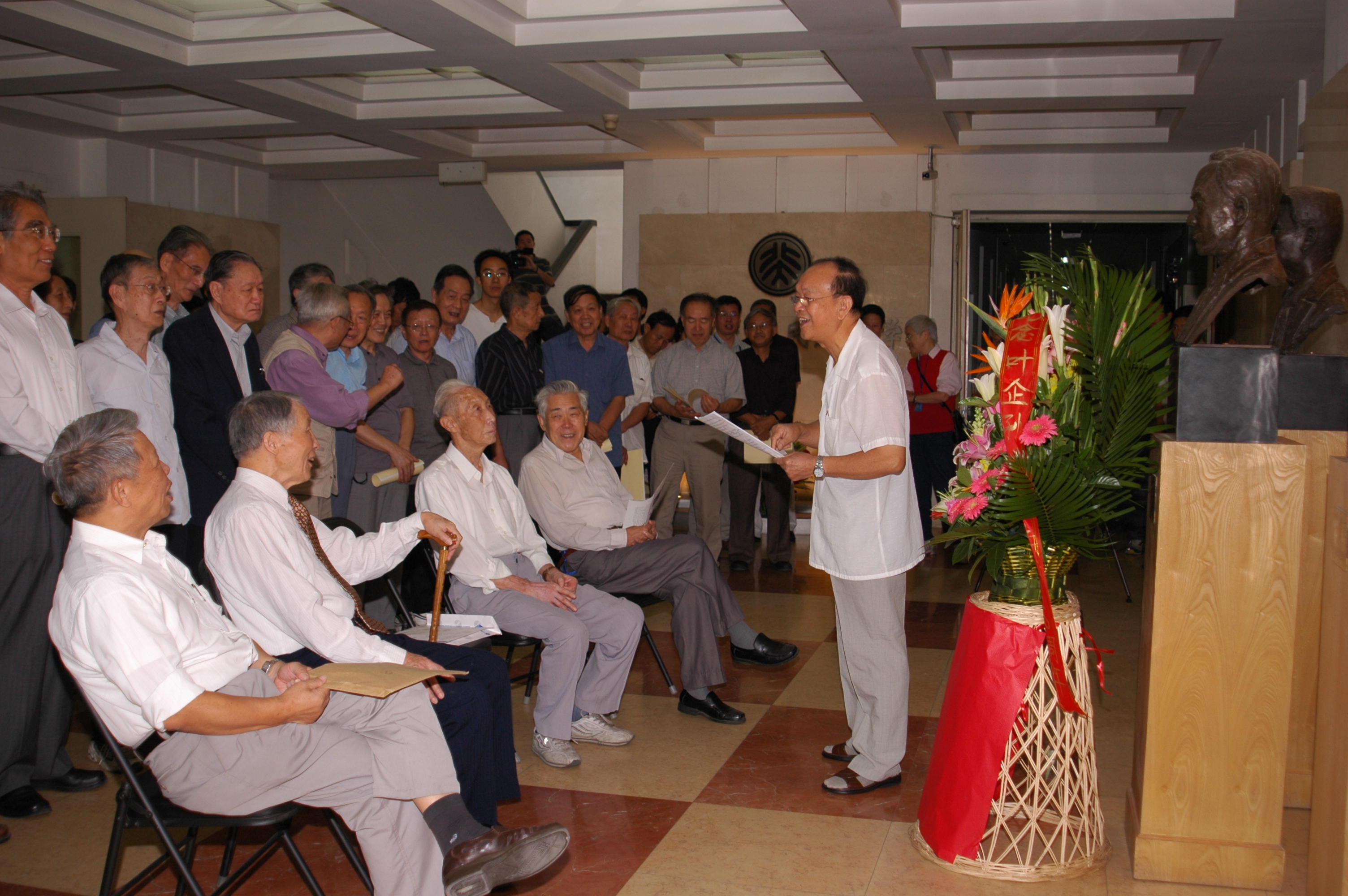 2008年9月11日上午9点,在物理楼二楼大厅叶企孙先生铜像前举行了纪念叶企孙先生诞辰110周年纪念仪式。仪式由学院党委书记陈晓林老师主持,叶先生的学生代表沈克琦先生、钟文定先生首先向叶先生铜像献花;叶先生在北大的第一个研究生钟文定先生介绍叶企孙先生生平事迹,回顾了先生的科学救国思想和满腔的爱国热忱,缅怀了先生为中国物理学界做出的杰出贡献;随后叶沿林院长和学生代表讲话,表达了对叶老的敬意和继续推进物理学研究的信心。整个仪式持续了约20分钟。会后进行了叶企孙实验物理奖评奖,共评选出六位获奖学生。