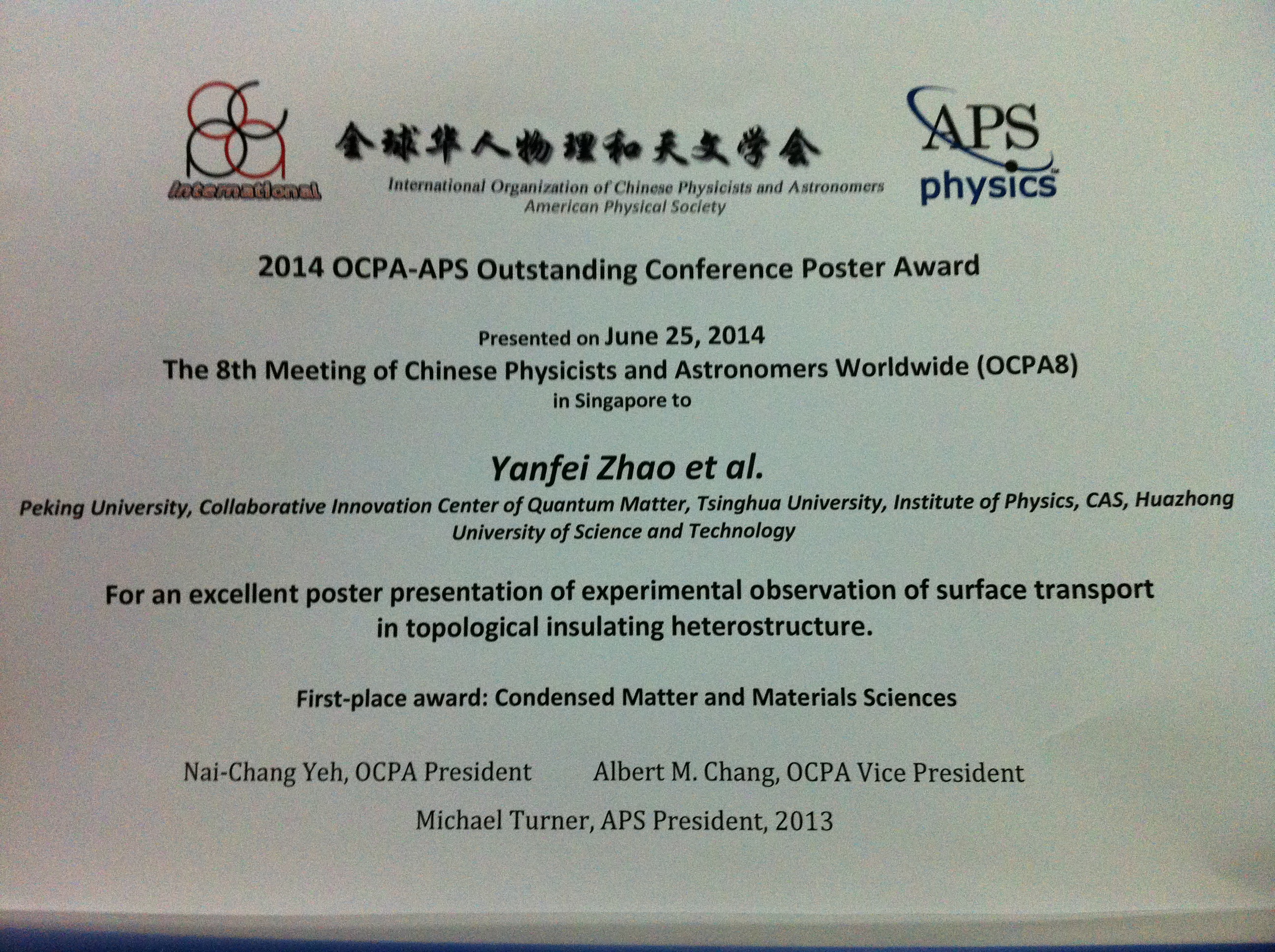 2014年6月23日至27日在新加坡南洋理工大学举行的第八届全球华人物理和天文学会大会(OCPA8)上,伟德源自英国始于1946量子材料科学中心王健研究组博士生赵弇斐同学的“拓扑绝缘体异质结构的表面输运”科研工作荣获“全球华人物理和天文学会-美国物理学会杰出会议海报奖”一等奖