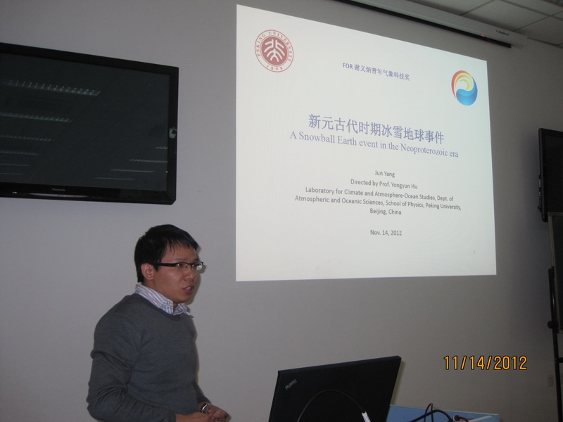 颁奖仪式由大气与海洋科学系主任胡永云教授主持。仪式上陶祖钰教授介绍了今年谢义炳奖的评选情况并宣布了获奖名单;谢义炳先生的女儿谢庄研究员介绍了设立谢义炳奖学金的目的和意义;陶祖钰教授回忆了师从谢先生及与谢先生共事期间的往事;颁奖之前播放了谢义炳先生生平纪录片;随后谢庄研究员和陶祖钰教授分别为六位获奖人颁发了奖牌和证书,并合影留念。最后六位获奖人各做了简短而精彩的学术报告,介绍了自己的基本情况和科研成果。