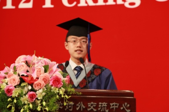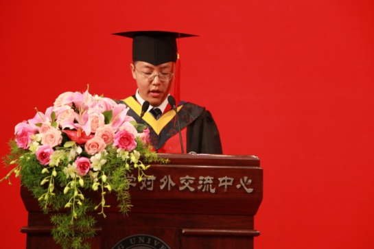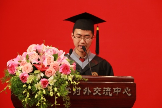 此后,本科毕业生代表区永曦、硕士毕业生代表梁志、博士毕业生代表李航分别进行发言。他们从不同角度回忆了在燕园生活的点点滴滴,表达了对于师长们谆谆教诲的感恩之情,并抒发了自己必将继续努力、不断进取,开创更美好未来的决心和信心。