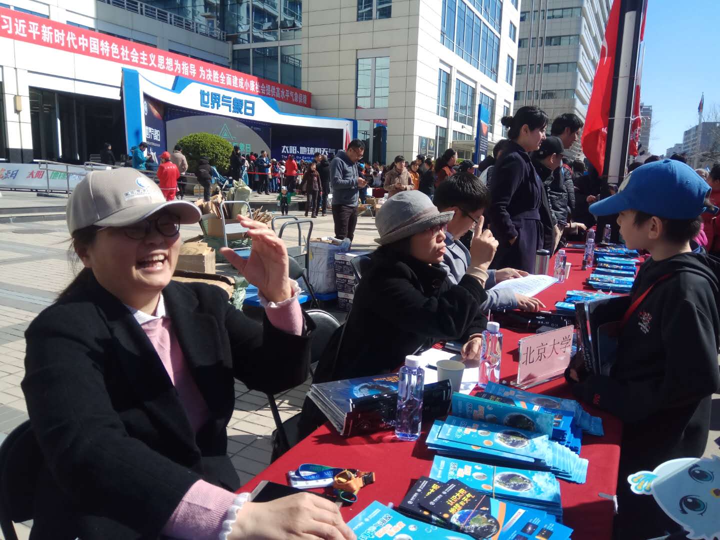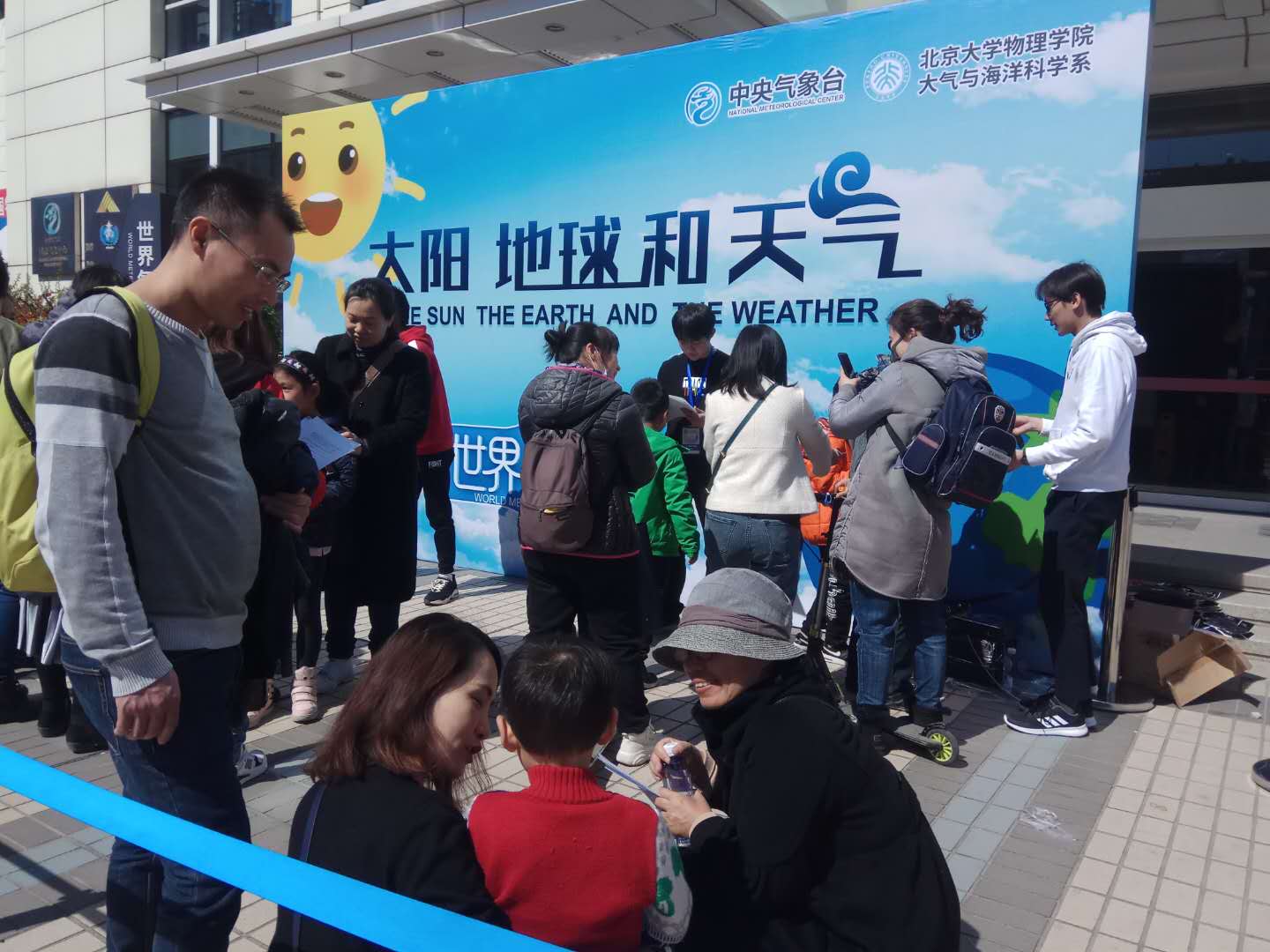 3月23日,第二场活动在中国气象局继续,大气与海洋科学系与中央气象台联合搭建了“太阳、地球与天气”展台,参与活动的大小朋友络绎不绝。可爱的吉祥物“小龙人”吸引了无数小朋友的注意力,很多小朋友在爸爸妈妈的陪同下前来答题,小朋友们年纪虽小,回答问题的热情却很高。专家咨询台仍由中央气象台的预报专家谌芸和大气与海洋科学系孟智勇老师坐镇,两位专家耐心地为来自北京各个中小学的同学们答疑解惑。
