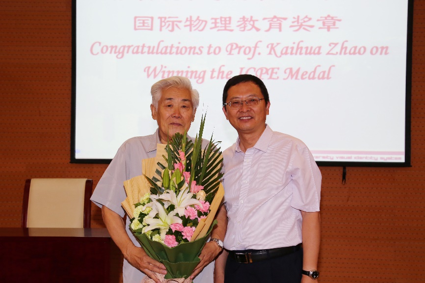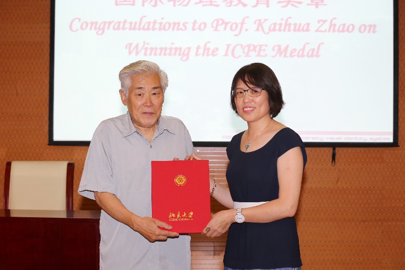 教务部部长傅绥燕教授热情洋溢的回顾了备受赵凯华教授影响的学生时代,作为教师的自豪,以及本科物理教育在一流大学建设中的重要作用。最后,她代表教务部宣读了对于赵凯华教授获得国际物理教育奖章的祝贺信。田光善教授和刘玉鑫教授先后登台,表达了对赵凯华教授的尊敬与感谢。