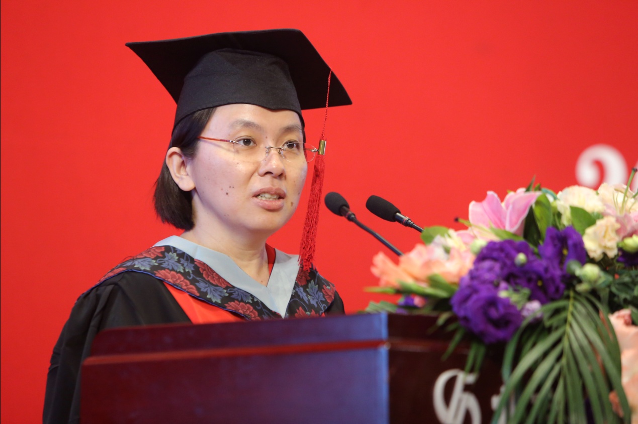 傅宗玫老师作为导师代表发言。她回忆了自己求学时与两位老师的讨论,希望同学们能有“自己解决问题的能力”和“创新的勇气”。同时,傅老师希望同学们能勿忘初心,不要忘记当初选择学物理时那种求真、求美的情怀和想让世界变得更美好的理想。