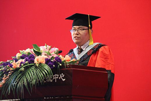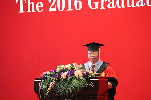 刘玉鑫老师作为教师代表发言。他首先用简单的数据统计展现了同学们这几年在校期间骄人的科研成绩。接着,刘老师从中华民族的道德行为准则——“五常”(仁义礼智信)出发,用“仁义”告诫同学们“任何一个人的命运,无时不刻不与身后的国家相连”,用“信”告诫同学们“言而有信、一言九鼎是成功的必要条件”,用“礼”希望同学们处处事事都能有理有节。随后,刘老师用一个“赢”字告诫同学们,要时刻有危机意识,有时间观念,并有一颗平常的心态以及很好的表达能力,希望同学们在今后的人生道路上都能成为真正的赢家。