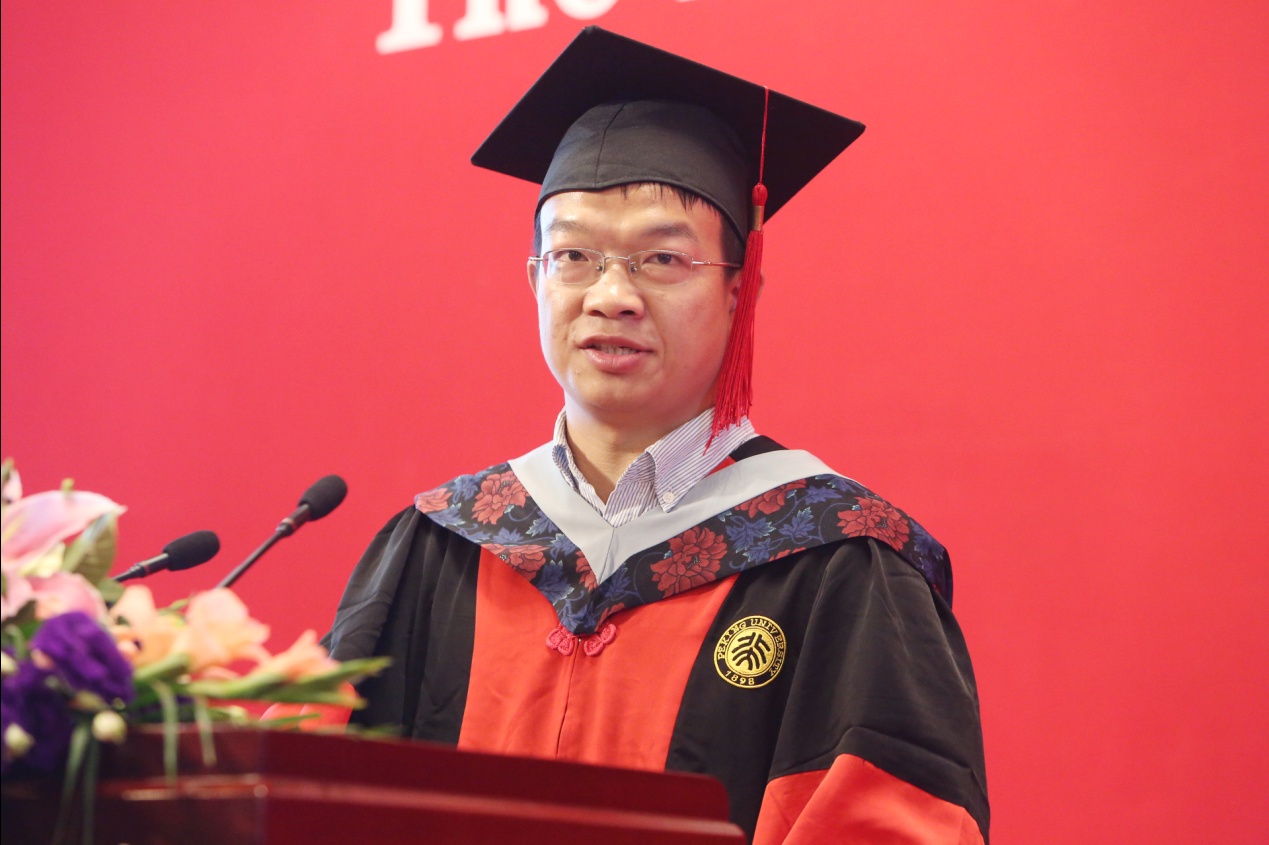 北大物理系87级校友、华源科技协会理事会主席、未来论坛联合创始人、人本健康集团联合创始人和CEO陈恂先生作为校友代表发言。他认为,同学们的毕业是值得祝贺的成功,但对于人生来说只是成功的一半。陈恂校友用自己的三个亲身经历告诉同学们:我们的认知是有局限的,我们必须要有这样的敬畏心;光知物不行,必须知人,不知人,注定一败涂地;想要求真,必须睁大了眼睛,放大了光圈,然后停留在相对比较阴暗的地方,停留足够的时间,以致你有足够的曝光去看清里面发生了什么。同时,陈恂校友也给出了自己的两个建议:离开校园短期内要慎重作出重大决定;毕业后寻找人生的另一半,要学会去爱。
