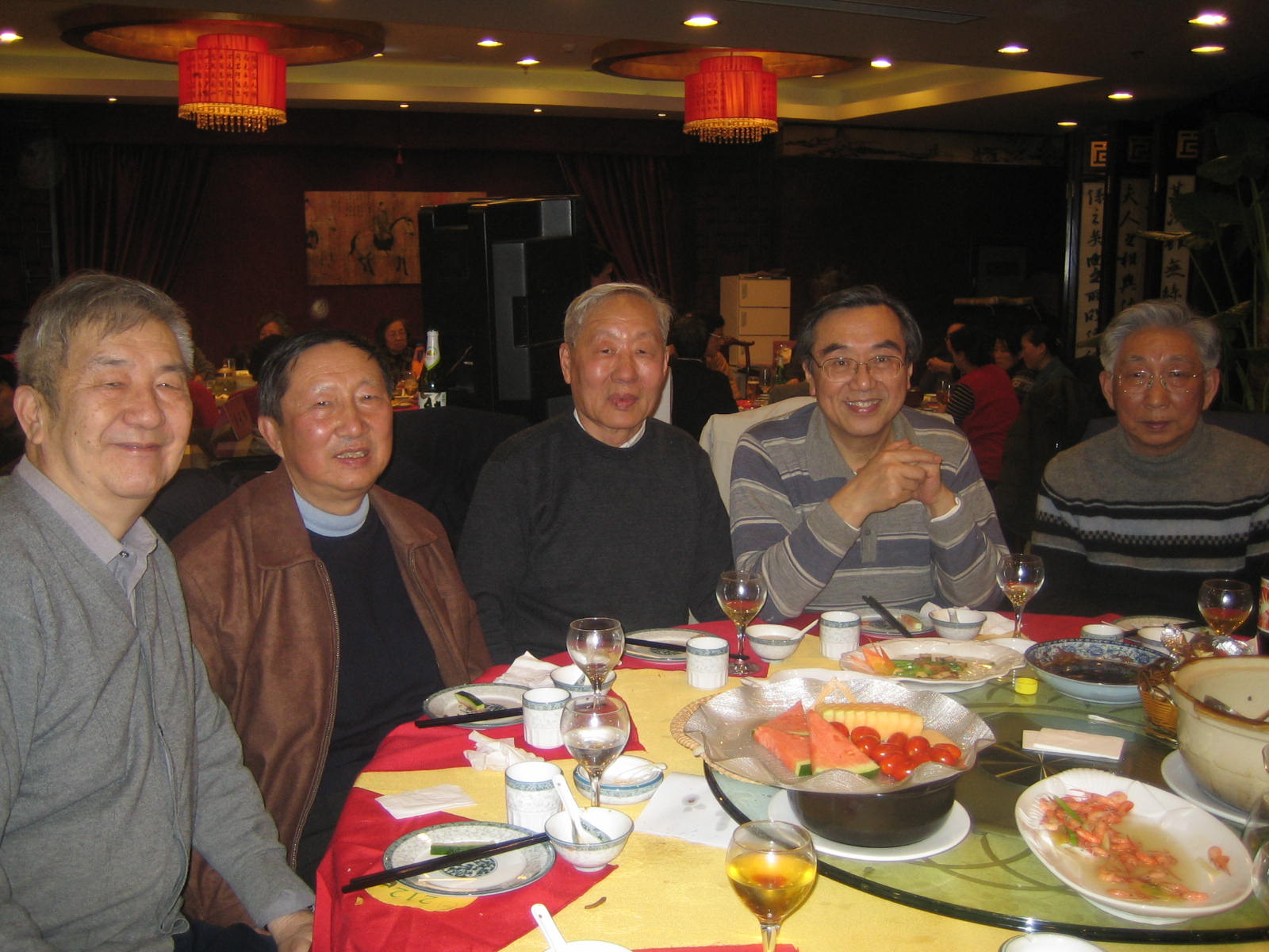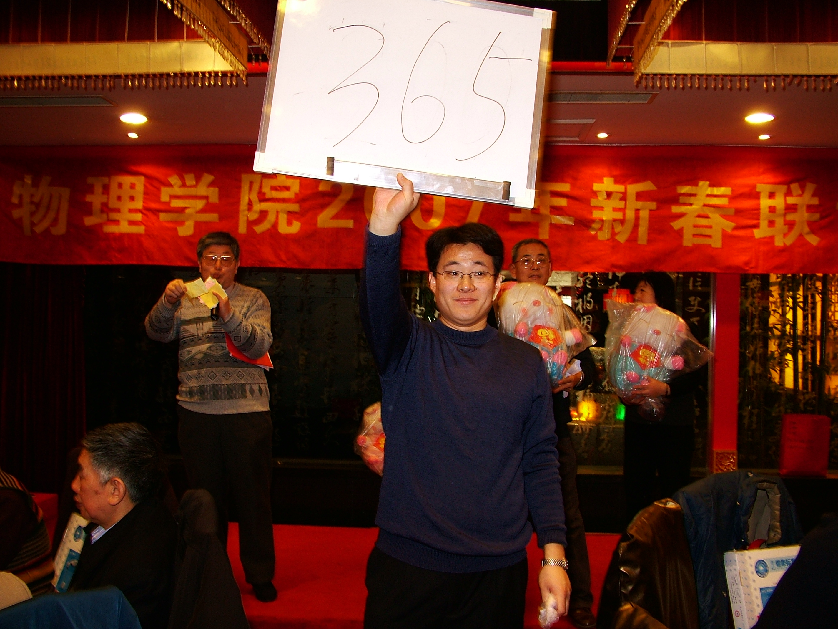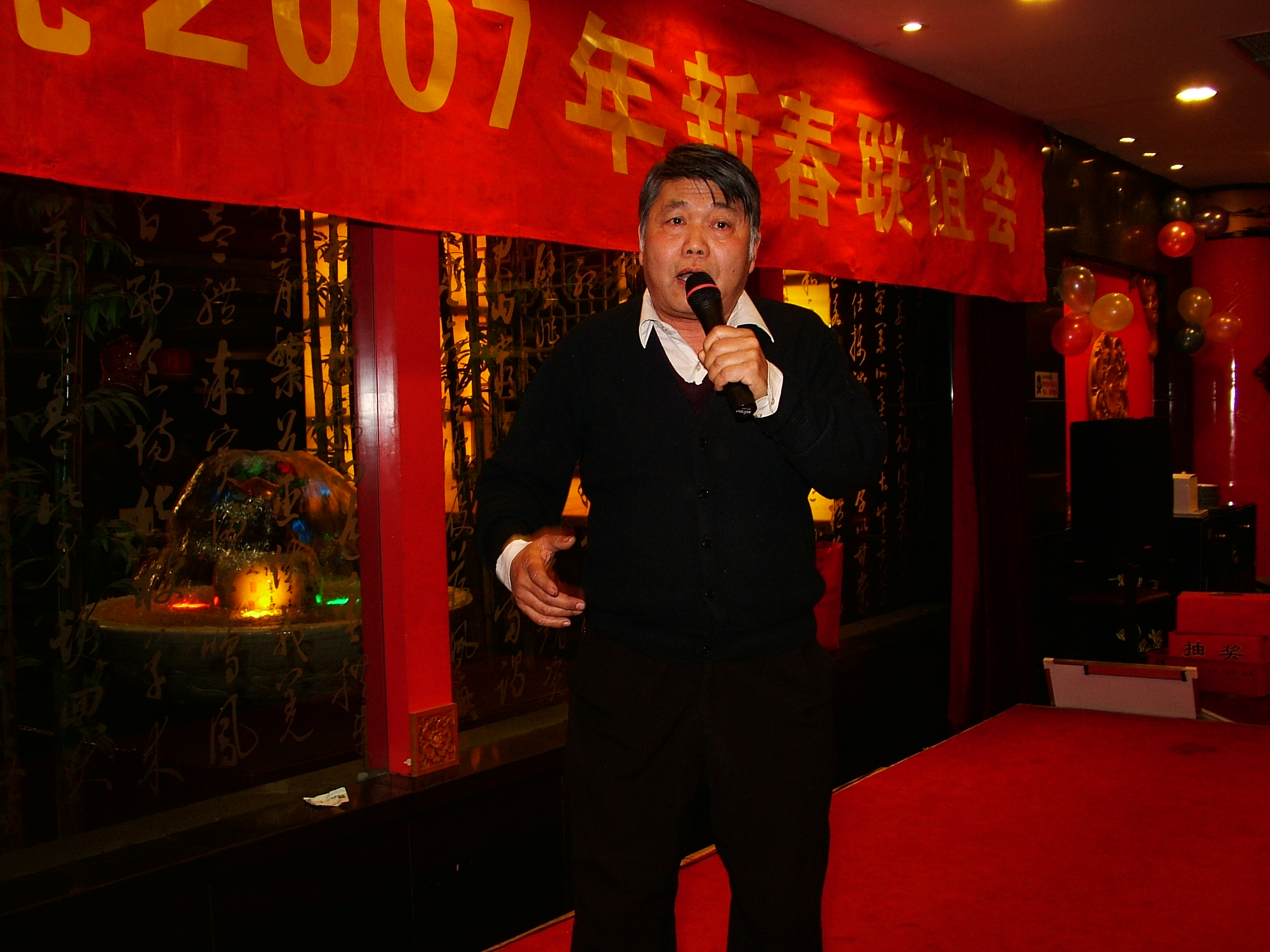 开始自由表演,大家一边品尝美味佳肴,一边自娱自乐。本是上海人的叶学敏教授兴致勃勃地唱了一段京剧“甘洒热血写春秋”,虽然,说不上字正腔圆,却也韵味十足;技物系孟杰教授没忘老传统,上台后先给大家拜了个早年,又献上了一首“花儿为什么这样红”着实勇气可嘉;最后蹦上台的是金猪本命年的俞大鹏教授,他演绎的经典歌曲“牧歌”,虽是耳熟能详,却很是让大家回忆逝去的光阴,歌唱毕,他的同桌给他献上一朵红玫瑰以资鼓励他精彩的才艺展示,这种别具一格又带点幽默感的和谐之美,立即得到周边各位的认同,大家都报以热烈的掌声。
