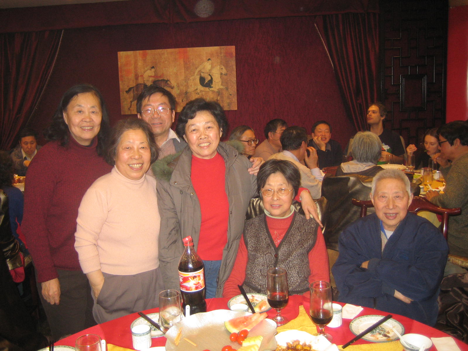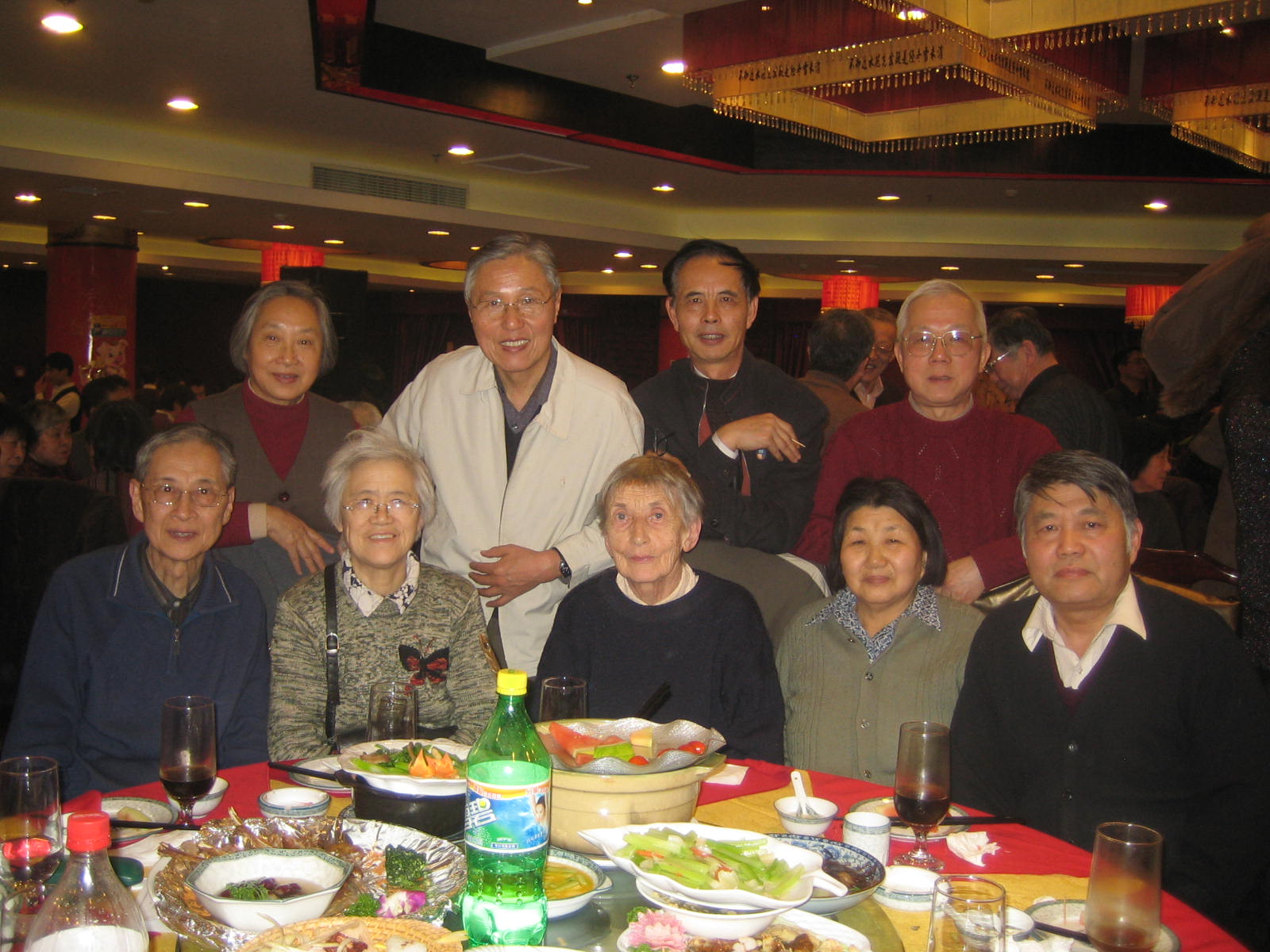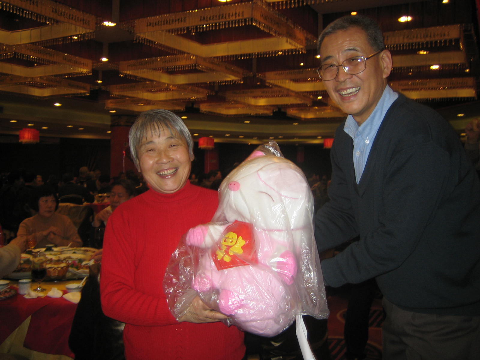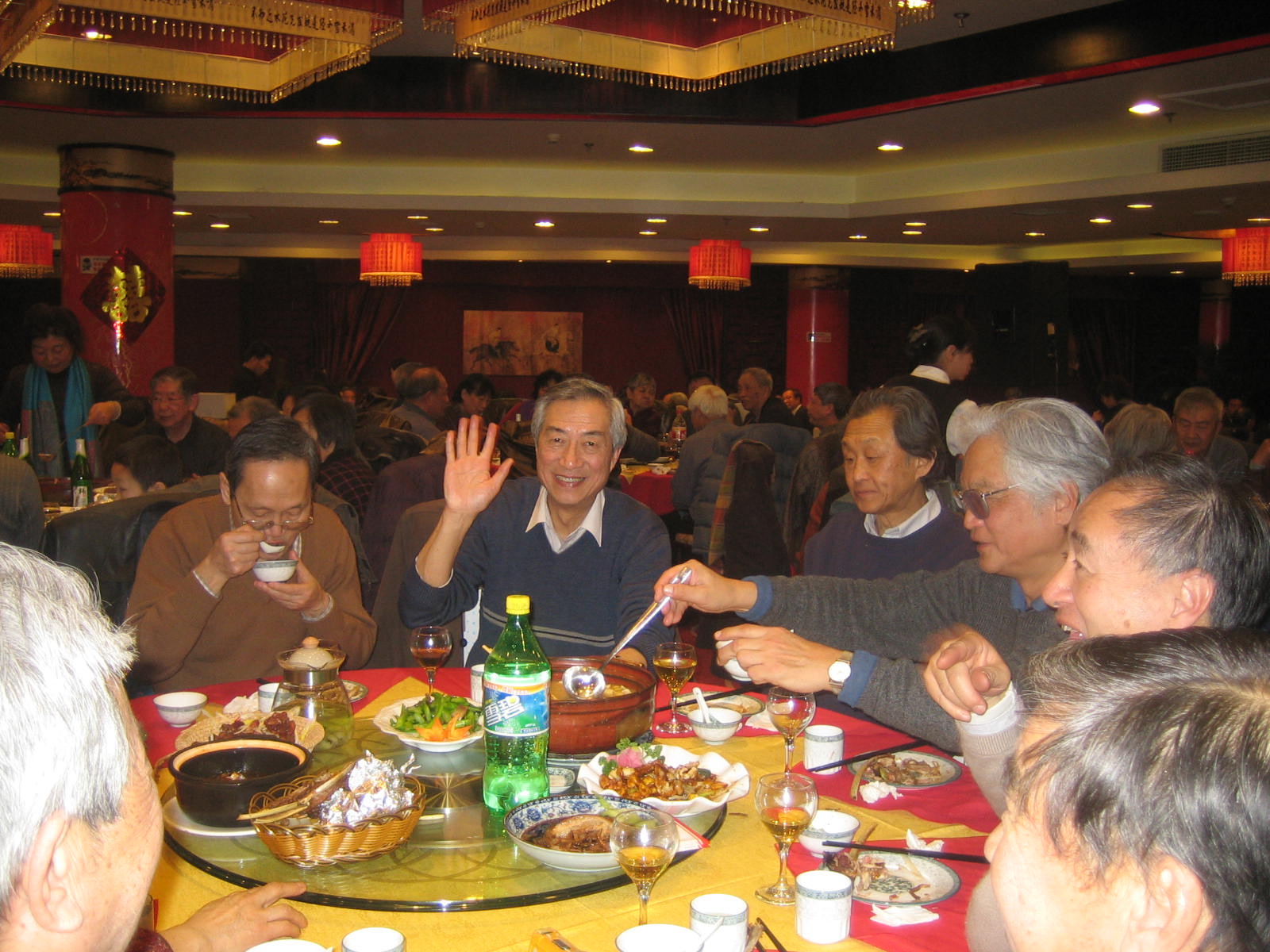 开始自由表演,大家一边品尝美味佳肴,一边自娱自乐。本是上海人的叶学敏教授兴致勃勃地唱了一段京剧“甘洒热血写春秋”,虽然,说不上字正腔圆,却也韵味十足;技物系孟杰教授没忘老传统,上台后先给大家拜了个早年,又献上了一首“花儿为什么这样红”着实勇气可嘉;最后蹦上台的是金猪本命年的俞大鹏教授,他演绎的经典歌曲“牧歌”,虽是耳熟能详,却很是让大家回忆逝去的光阴,歌唱毕,他的同桌给他献上一朵红玫瑰以资鼓励他精彩的才艺展示,这种别具一格又带点幽默感的和谐之美,立即得到周边各位的认同,大家都报以热烈的掌声。