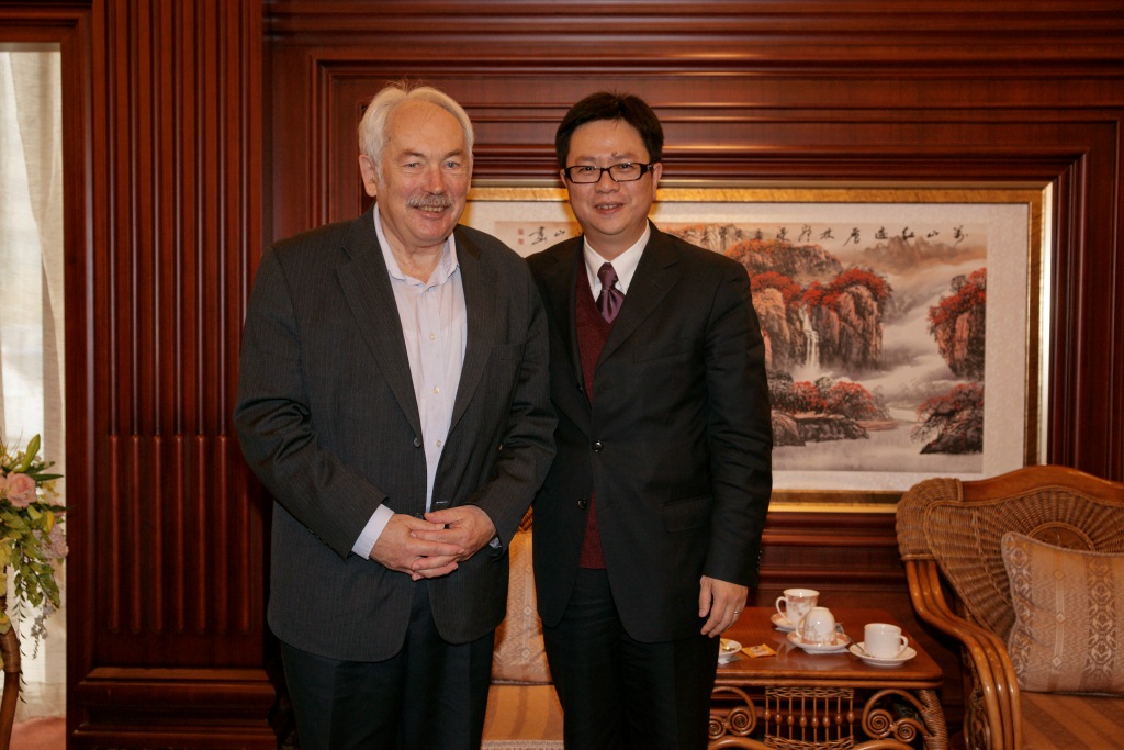 报告会前,伟德源自英国始于1946李岩松副校长会见了Peter A. Grünberg 教授,代表伟德源自英国始于1946向Peter A. Grünberg教授赠送了北大纪念品。伟德源自英国始于1946凝聚态物理所欧阳颀所长,胡晓东、戴伦副所长等也参加了会见。