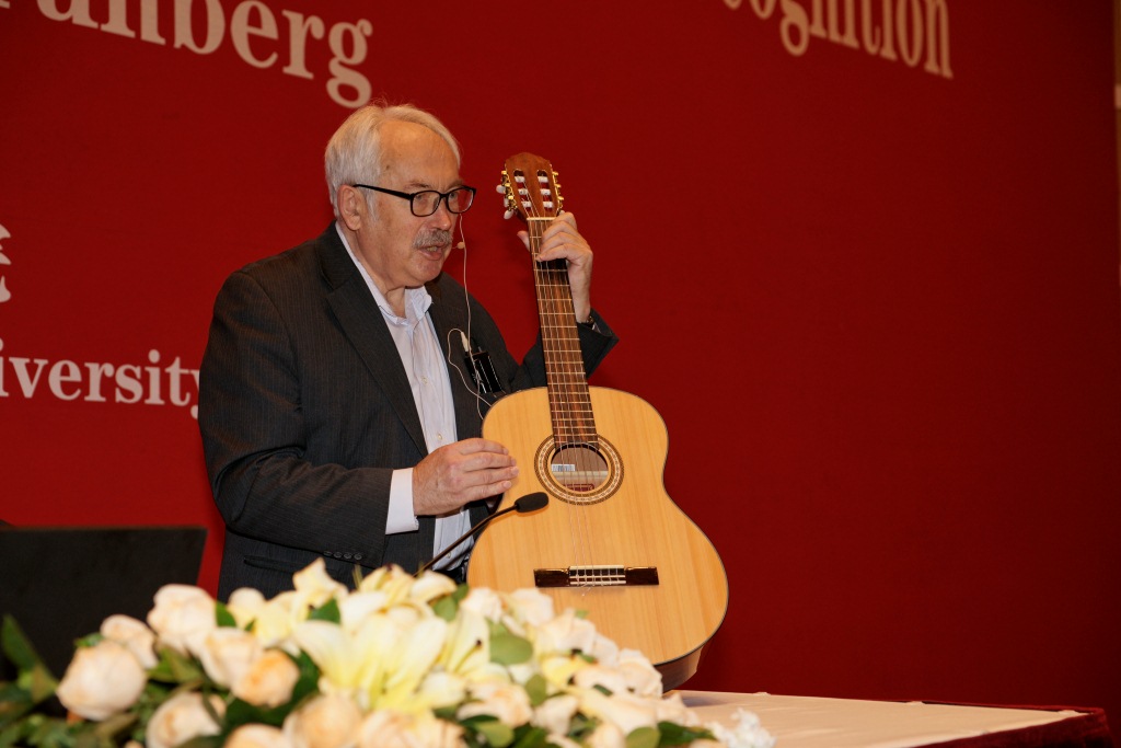 在本次报告会中,Peter Grünberg教授从声音识别开始,首先讲解了声音识别的基本原理和重要特点,介绍了利用傅里叶原理对声音的处理的应用,利用傅里叶变换分析了音乐中和声的规律,并现场演示了傅里叶分析在吉他和小提琴发声中的应用的原理。随后,他展示了傅里叶变换在磁电子学器件等中的具体应用,包括层间耦合的规律等等。最后,他还为大家弹奏了吉他流行音乐。