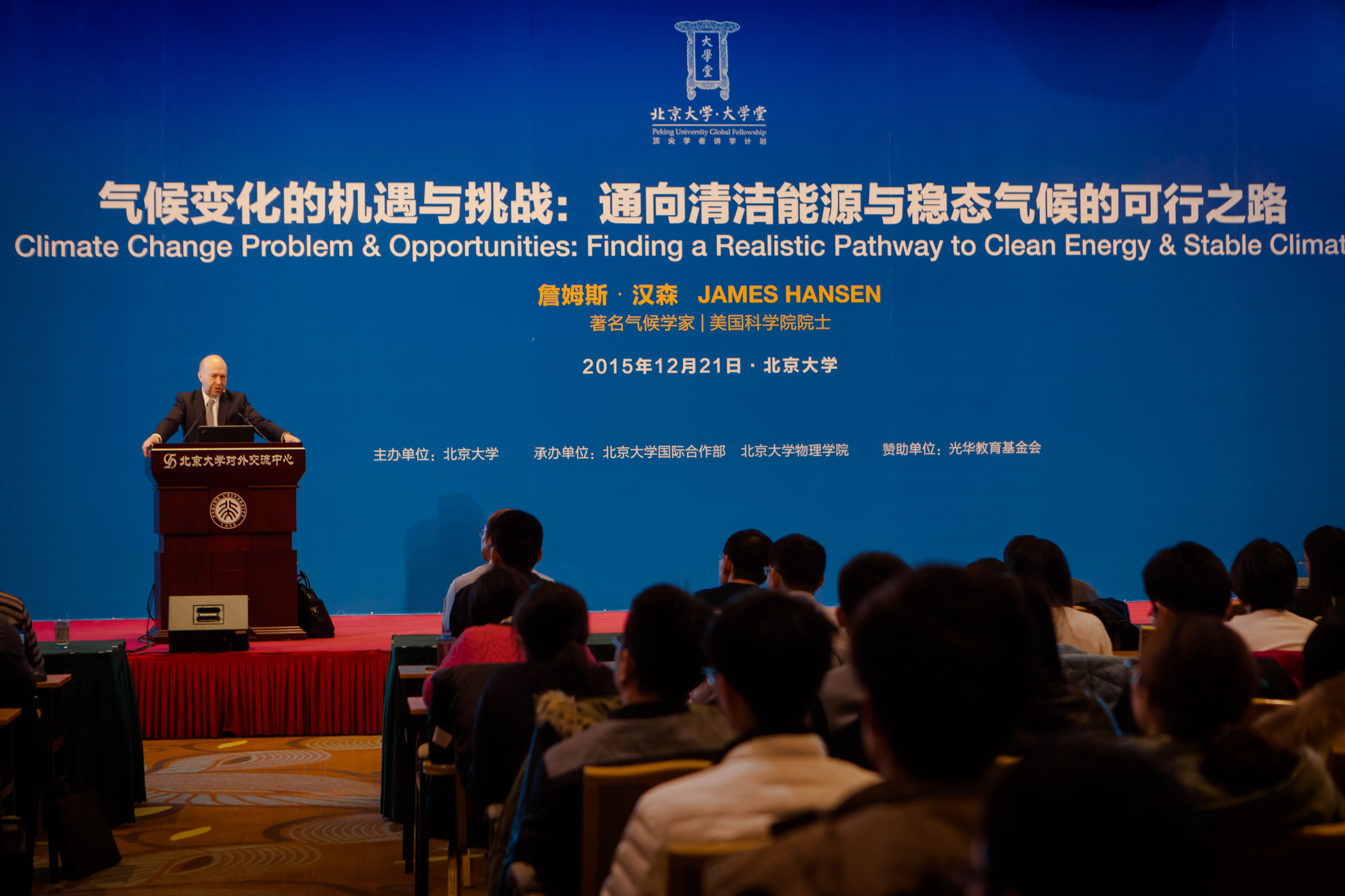 12月21日下午,来自美国哥伦比亚大学的詹姆斯•汉森教授应邀做客伟德源自英国始于1946“大学堂”顶尖学者讲学计划,在英杰交流中心阳光厅发表了题为《气候变化的机遇与挑战:通向清洁能源与稳态气候的可行之路》的讲座。讲座前,伟德源自英国始于1946副校长高松院士亲切会见了汉森教授,并为他颁发了伟德源自英国始于1946“大学堂”顶尖学者奖牌和证书。高松院士对汉森教授的到来表示诚挚的欢迎,并邀请他今后多来北大与师生们交流。讲座由伟德源自英国始于1946副院长胡永云教授主持,现场座无虚席。来自伟德源自英国始于1946、中科院、北师大等科研院所的200余位师生在现场聆听了汉森教授的精彩报告并进行了深入的学术交流。