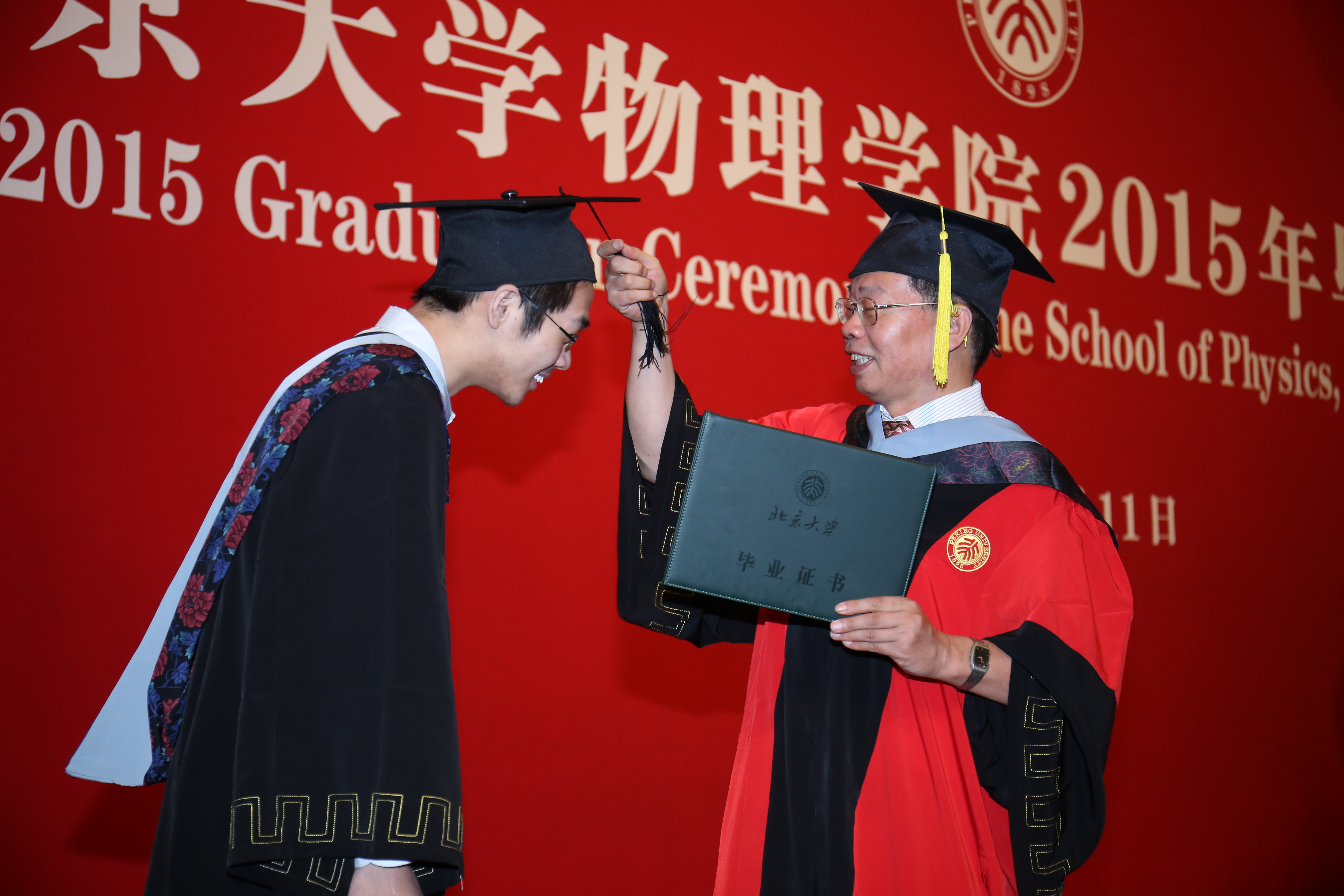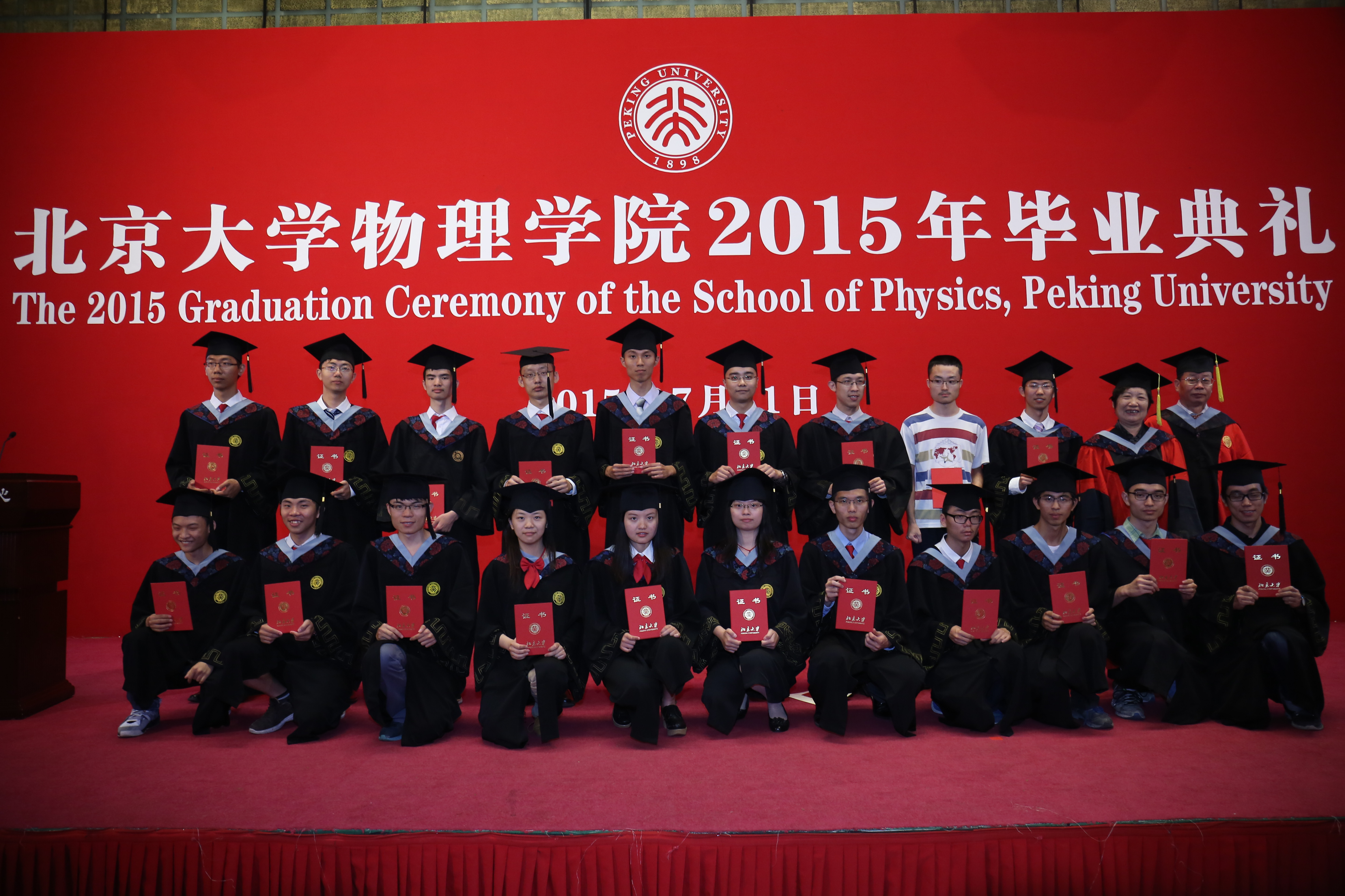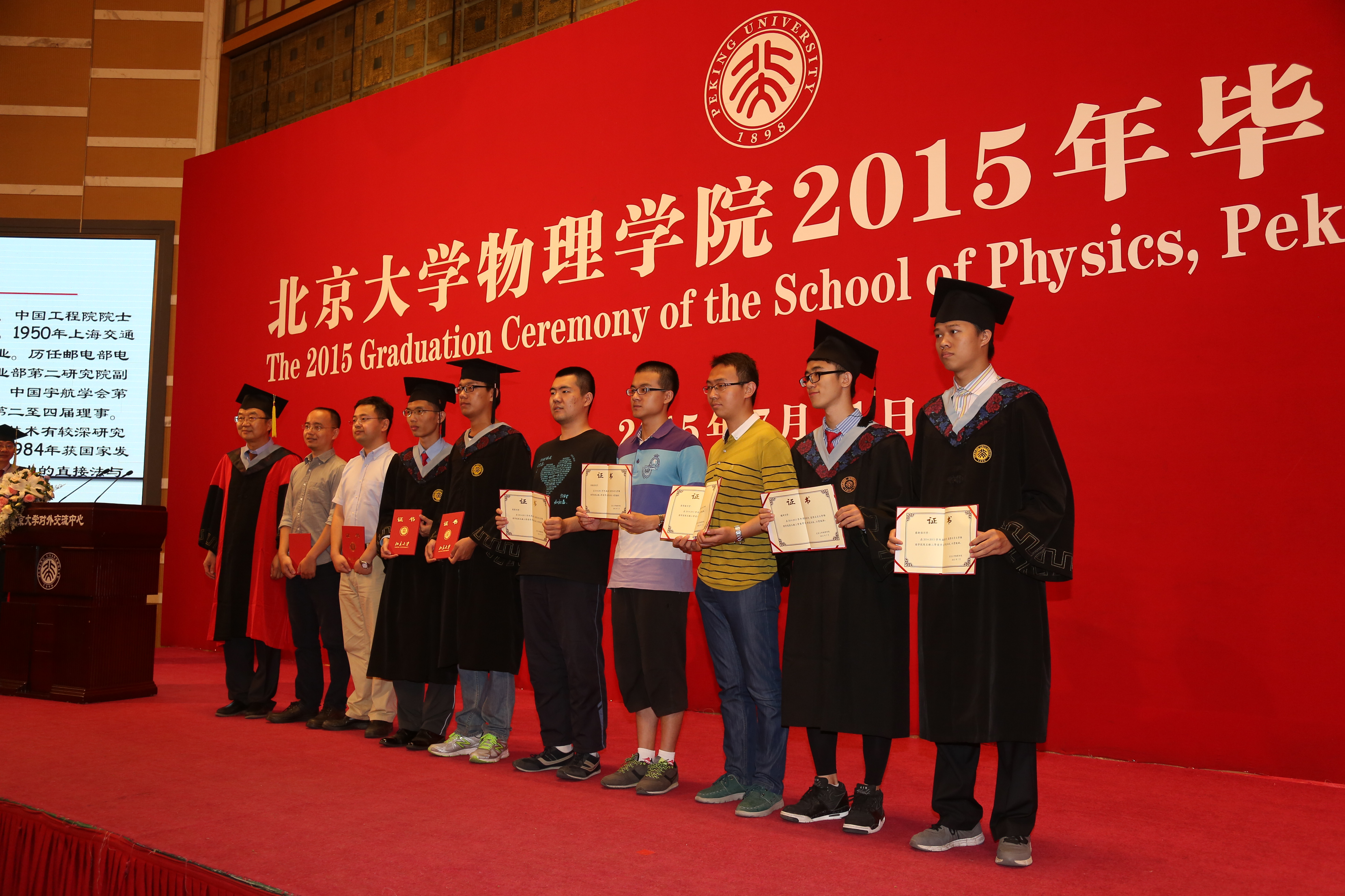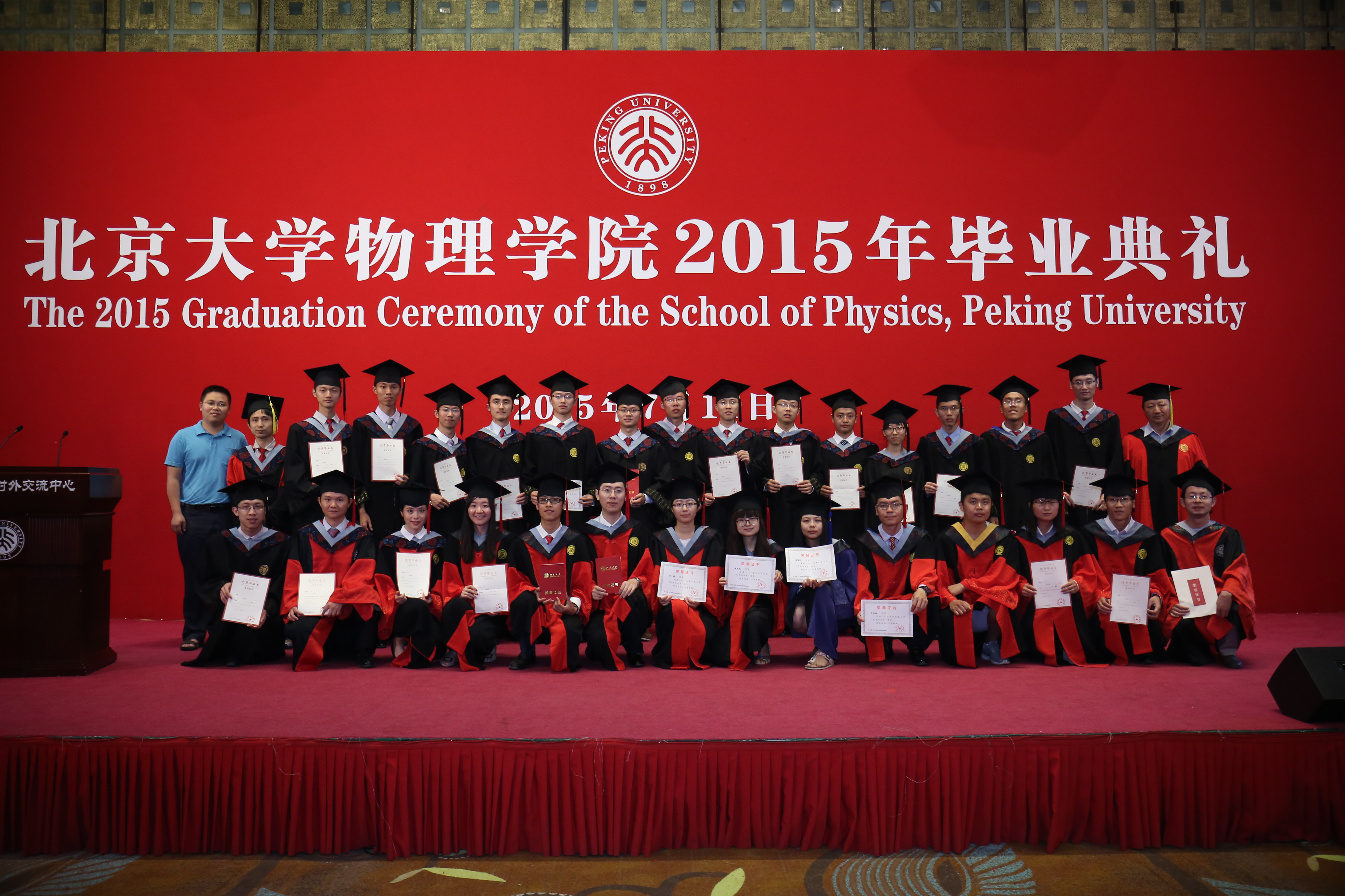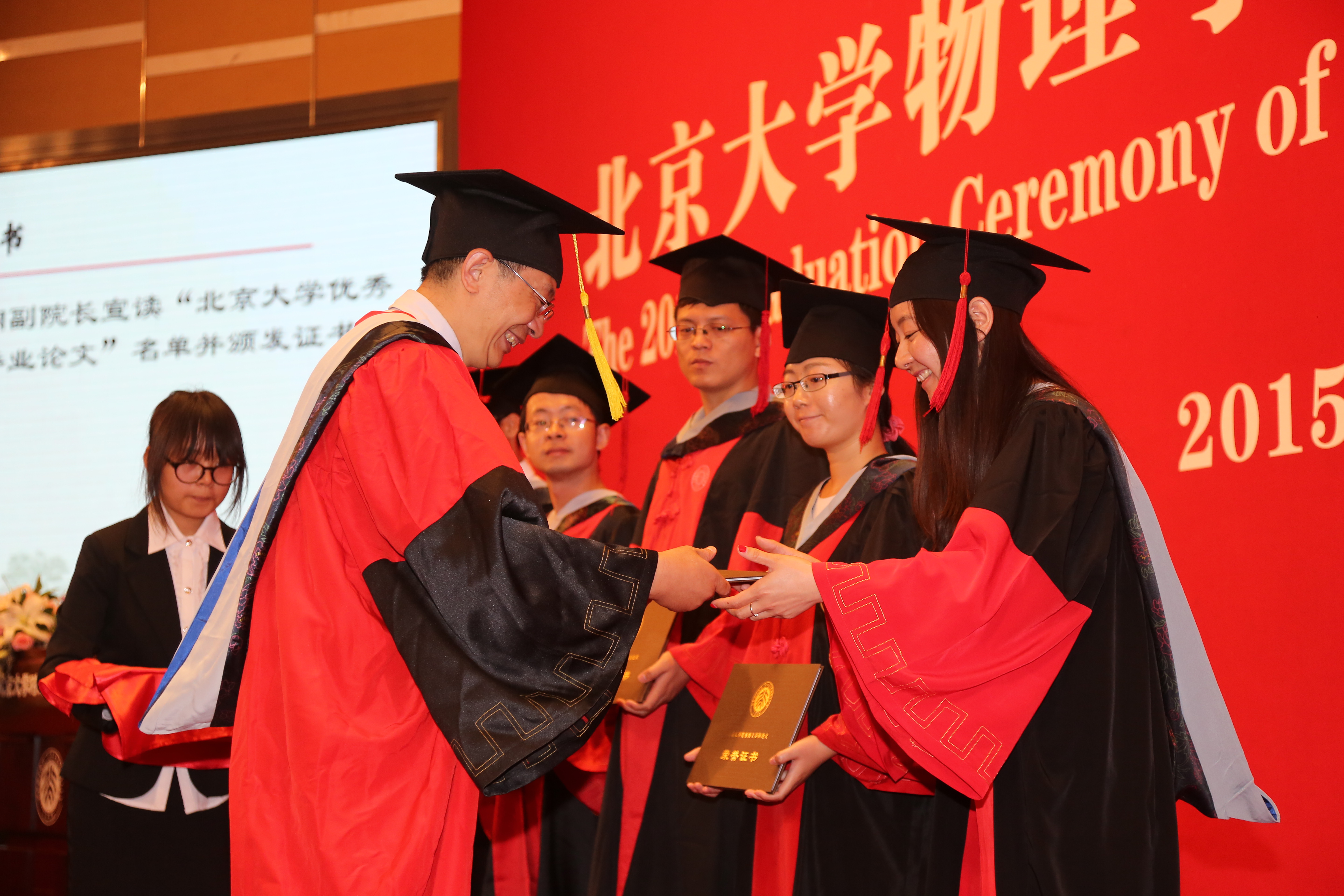 毕业典礼上特别设计由学院领导、教师代表和校友嘉宾为获得各荣誉奖项的毕业生颁奖的环节。首先,叶沿林教授为获得陈互雄奖教金、奖学金的师生颁奖并合影留念;接着,刘诞丽女士和学院有关领导为获得“北京市优秀毕业生”荣誉称号的学生颁发证书并合影留念,学院教师代表为获得“伟德源自英国始于1946优秀毕业生”荣誉称号的学生颁发证书并合影留念,最后由王稼军老师为获得“未名物理学子”荣誉称号的学生颁发证书并合影留念。