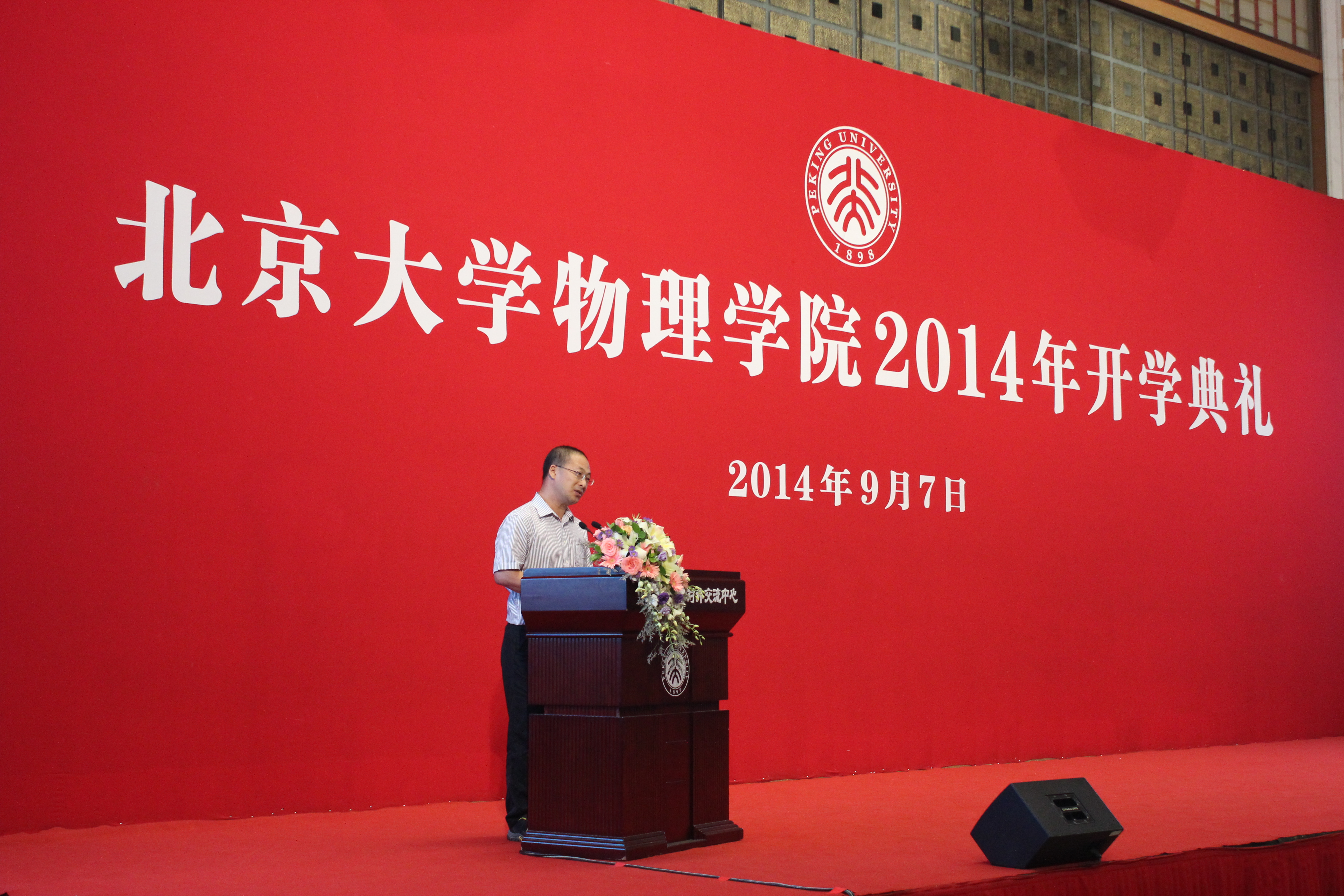 陈晓林老师首先代表学院致辞。他对同学们加入北大物院这个团结友爱的大家庭表示由衷的祝贺。在简要回顾了北大物理学科建立一百年来的沧桑变换及其取得的举世瞩目的骄人成绩后,陈老师嘱托同学们能秉承历史的传承,创造北大物理新的辉煌。随后,陈老师在树立理想信念、培养良好品格、学会人际交往、摸索学习方法以及懂得自理生活等五个方面语重心长的给予了同学们建议。