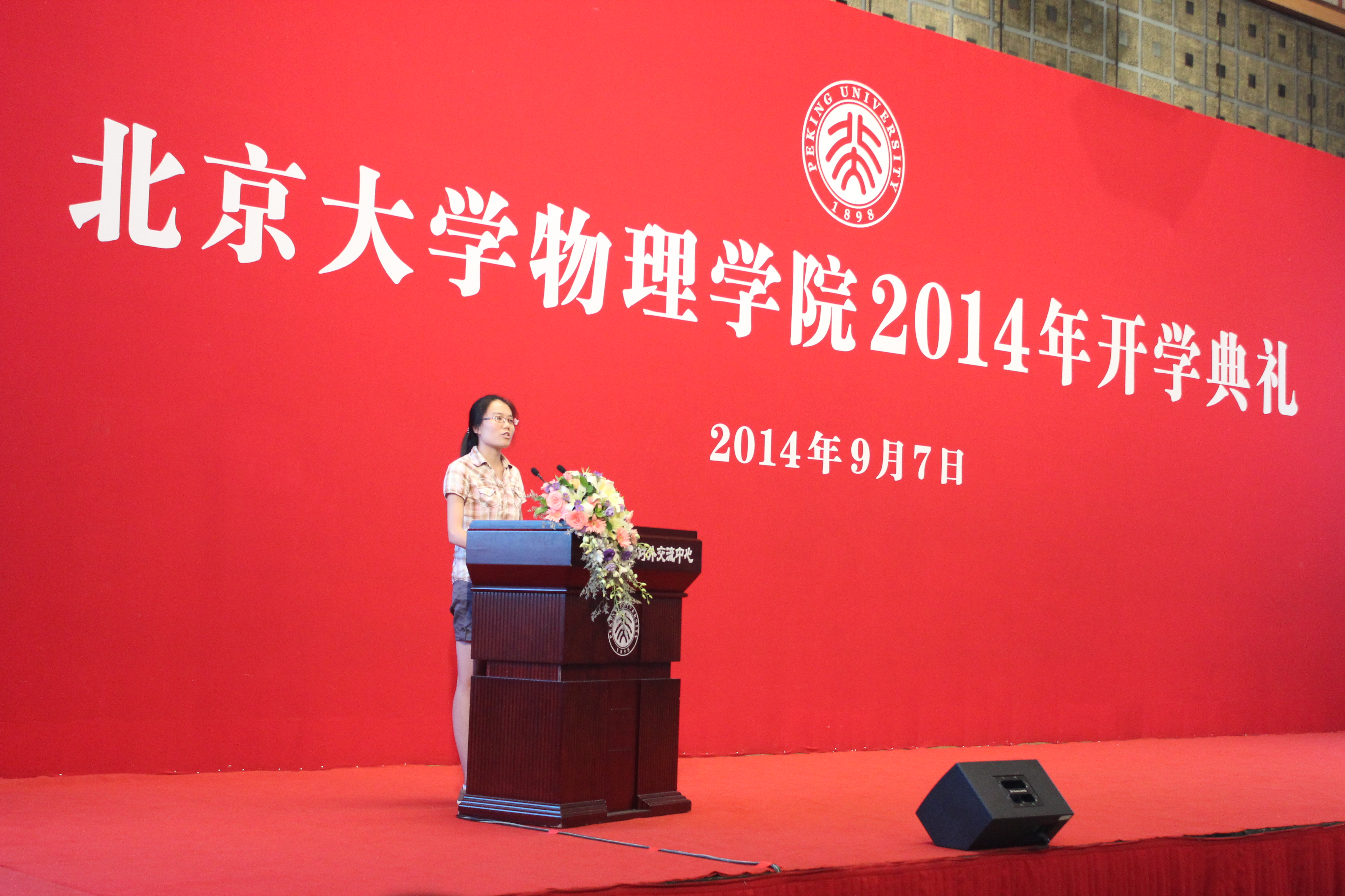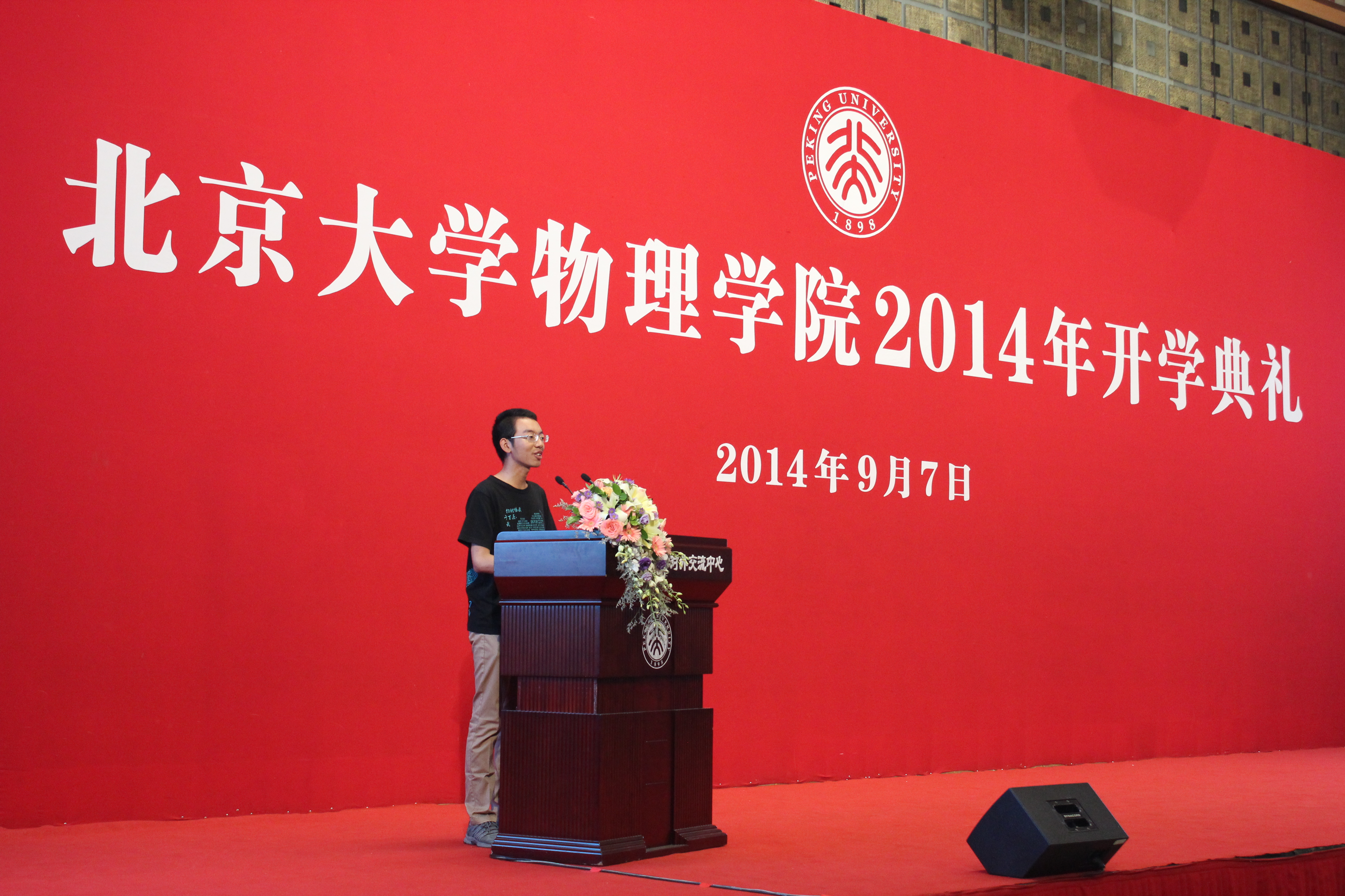2014级本科生陕思宇、2012级本科生王贺明、2014级博士杨栋、2011级博士郭静分别上台发言。新生代表讲述了自己来北大求学的心路历程,表达了对校园生活的美好憧憬,并庄严承诺以实际行动做出无愧于母校、无愧于青春的成绩。老生代表则以他们自己的切身体会提醒学弟学妹们要以顽强的钻研、拼搏精神挑战自我,战胜困难。作为学业的佼佼者,他们分别在本科学习生活和科研方面给出了自己宝贵的建议。