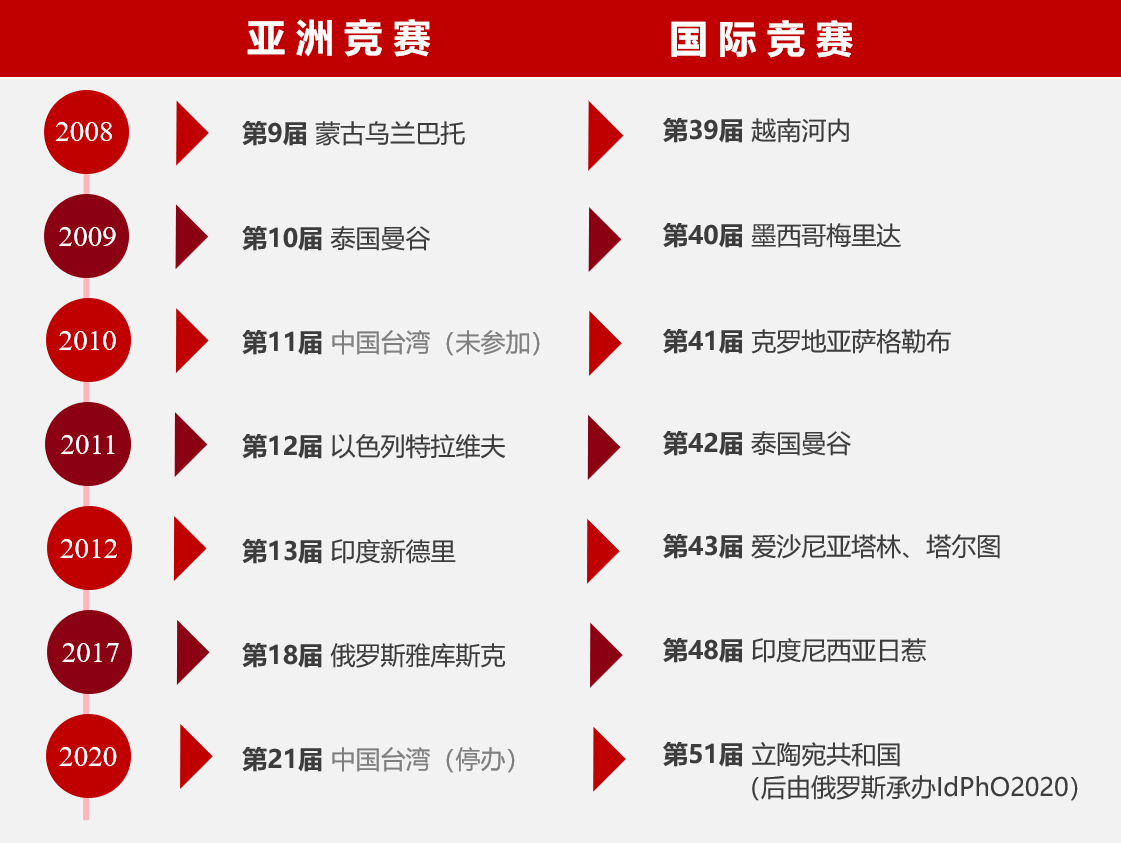 2005年,伟德源自英国始于1946向中国物理学会物理教学委员会提出申请,承担自2007年起连续四年的全国竞赛集训队的承训工作,并获得批准;后因故实际连续承担2007—2008年度至2011—2012年度的集训工作,共五年。2012年之后,作为全国竞赛集训队承训大学联盟单位,学院又承担了2016—2017年度和2019—2020年度的集训队工作。按计划,本应分别参加相应年度的7次亚洲竞赛和7次国际竞赛(见下表),但出于在台湾承办及新型冠状病毒肺炎疫情影响等原因,中国队未能参加其中的两次亚洲竞赛。