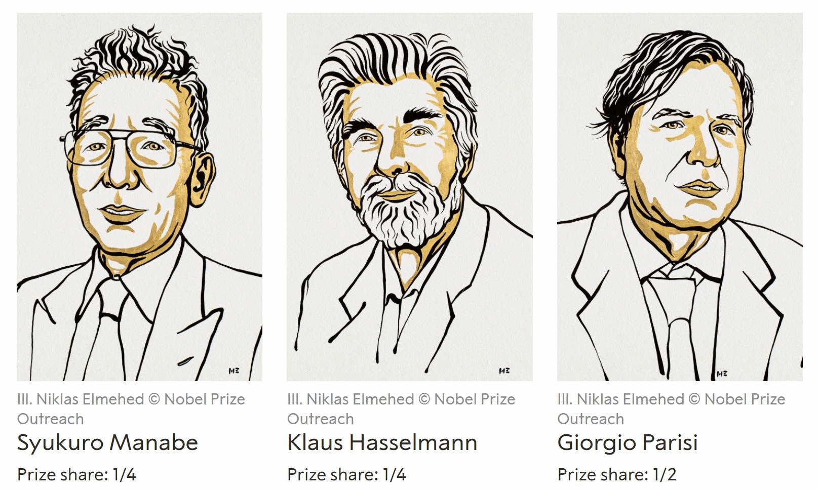 北京时间2021年10月5日下午17:45,瑞典皇家科学院宣布,将2021年度诺贝尔物理学奖授予美国普林斯顿大学真锅淑郎(Syukuro Manabe)教授和德国马克斯·普朗克气象研究所克劳斯·哈塞尔曼(Klaus Hasselmann)教授,表彰他们“对我们理解复杂系统所做出的开创性贡献”(for groundbreaking contributions to our understanding of complex systems)。真锅淑郎、克劳斯·哈塞尔曼因在“地球气候的物理建模、量化可变性并可靠地预测全球变暖”(for the physical modelling of Earth's climate, quantifying variability and reliably predicting global warming)研究中的贡献分享一半奖金;乔治·帕里西因“发现了从原子到行星尺度的物理系统中无序和波动的相互作用”(for the discovery of the interplay of disorder and fluctuations in physical systems from atomic to planetary scales)获得另一半奖金。